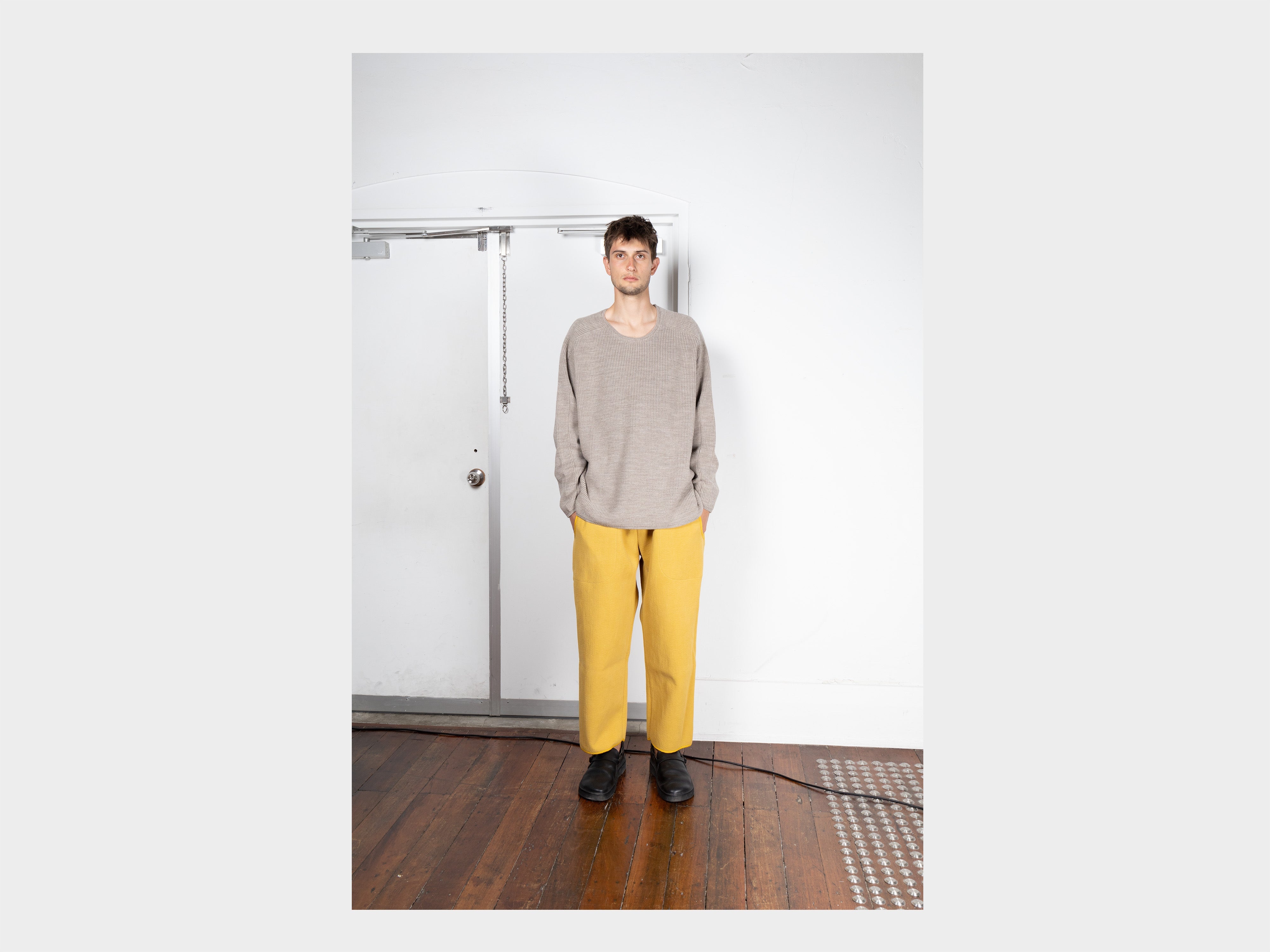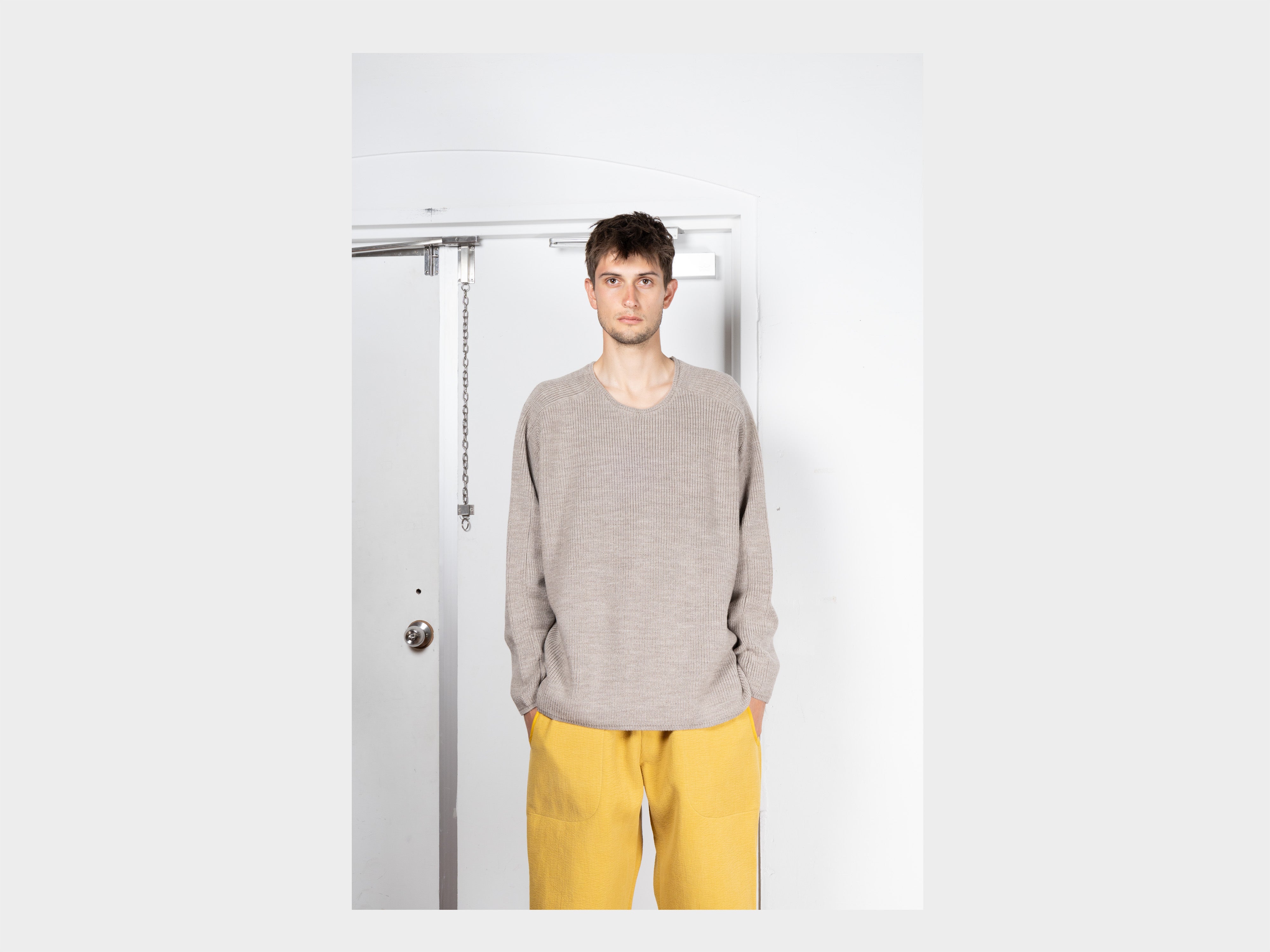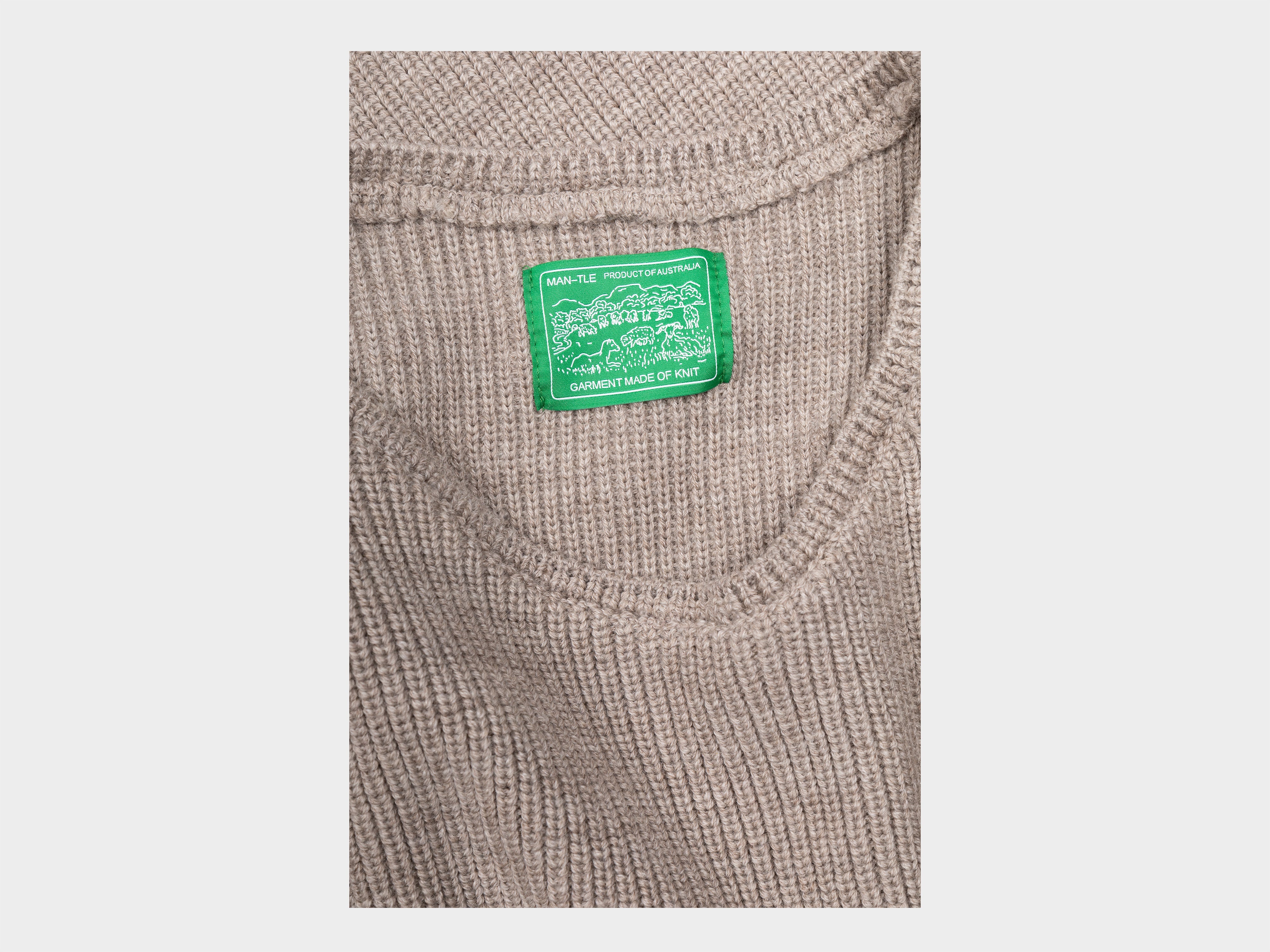+100% Polwarth Wool. Grown on the Tarndie farm in Warncoort, South-Western Victoria, where a single flock has been cared for by the same family since 1840. The greyish-brown fleece of Polwarth wool can only be scoured by one mill, EP Robinson, for just two weeks each year due to the risk of colour contamination across clean white wool lines. Grown, scoured, spun, and knitted in its natural colour for MAN–TLE in Victoria, Australia.