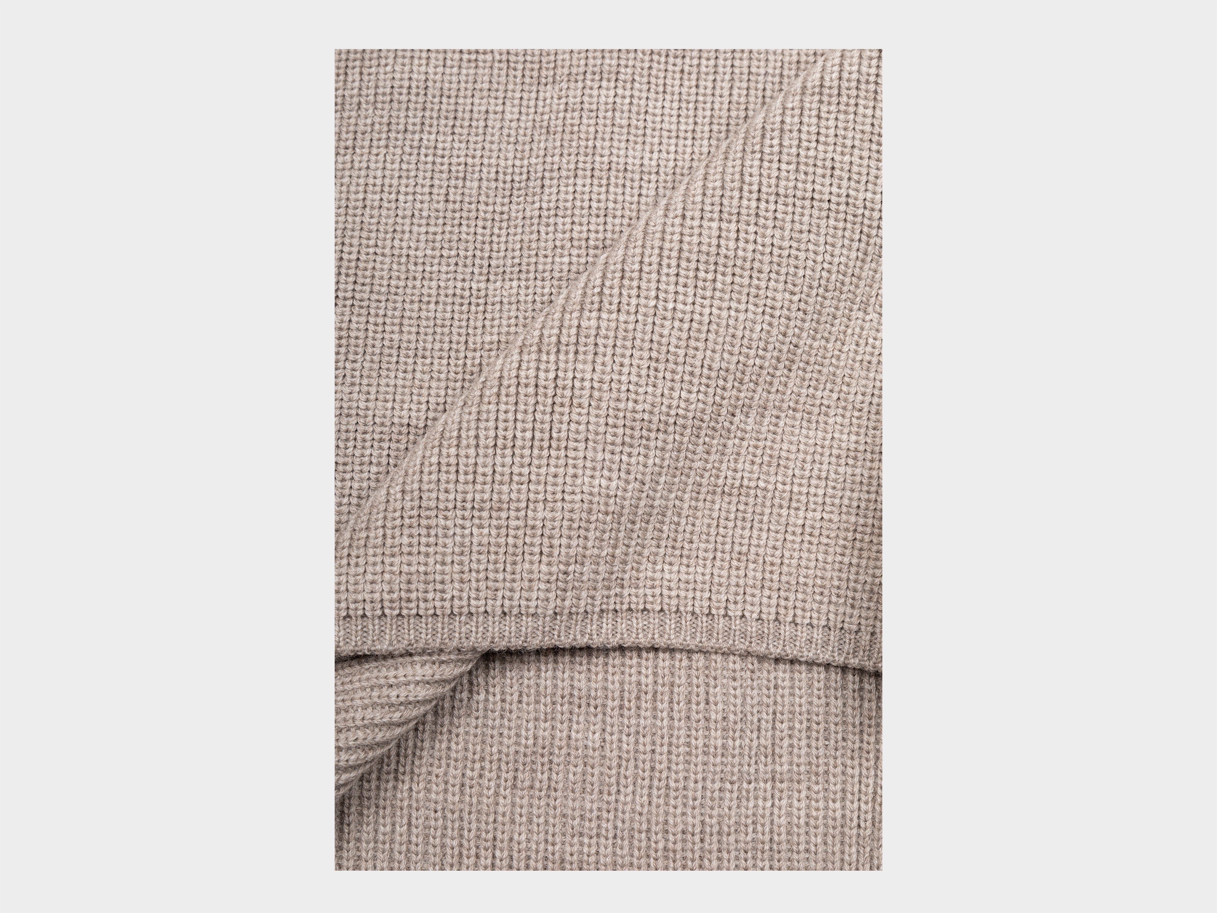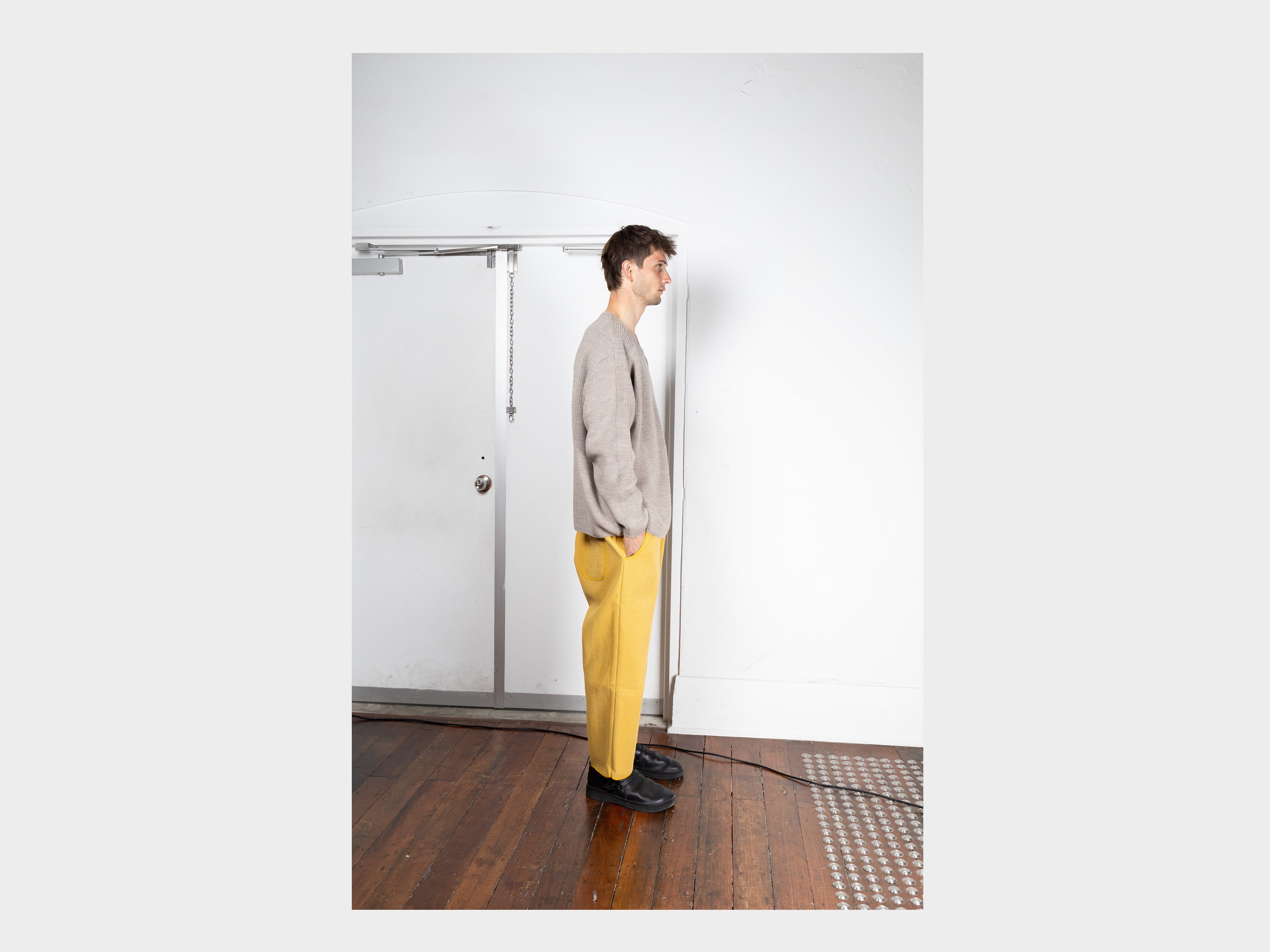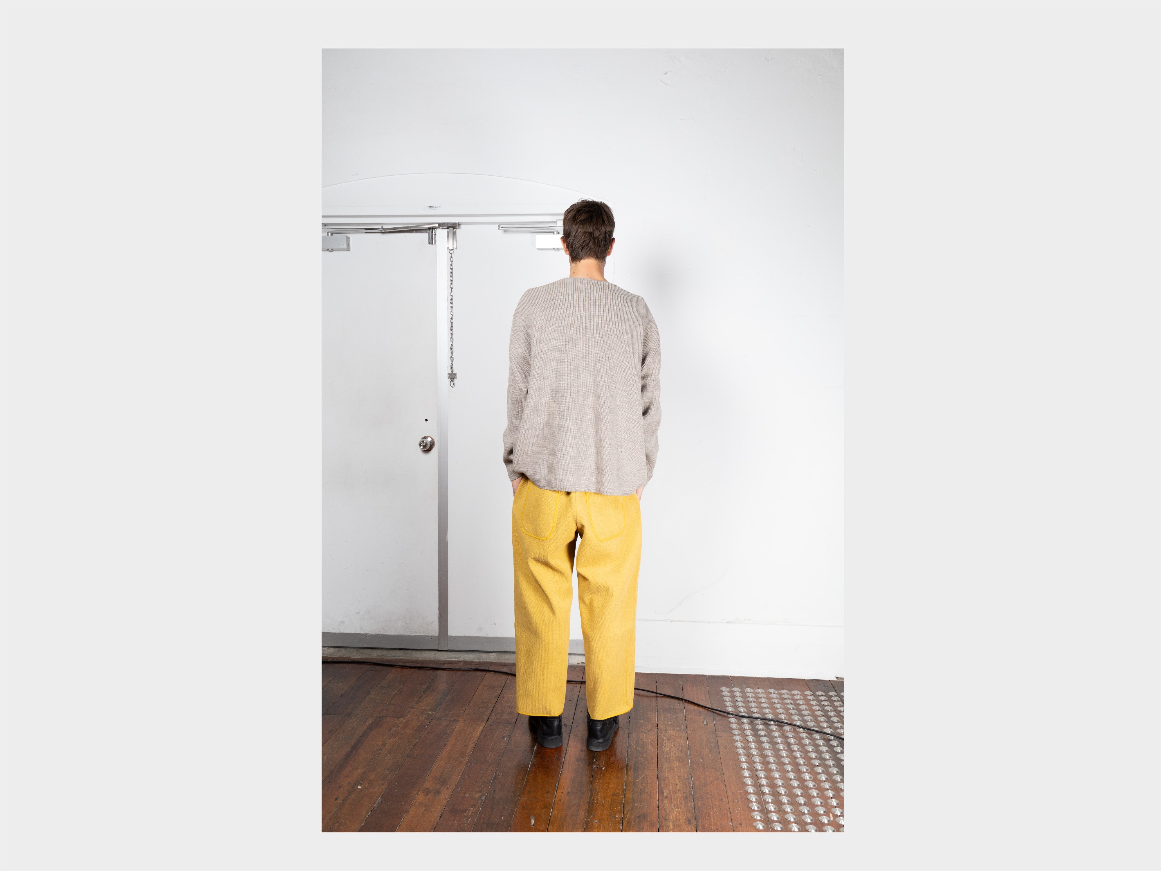 +100% Polwarth Wool. Grown on the Tarndie farm in Warncoort, South-Western Victoria, where a single flock has been cared for by the same family since 1840. The greyish-brown fleece of Polwarth wool can only be scoured by one mill, EP Robinson, for just two weeks each year due to the risk of colour contamination across clean white wool lines. Grown, scoured, spun, and knitted in its natural colour for MAN–TLE in Victoria, Australia.