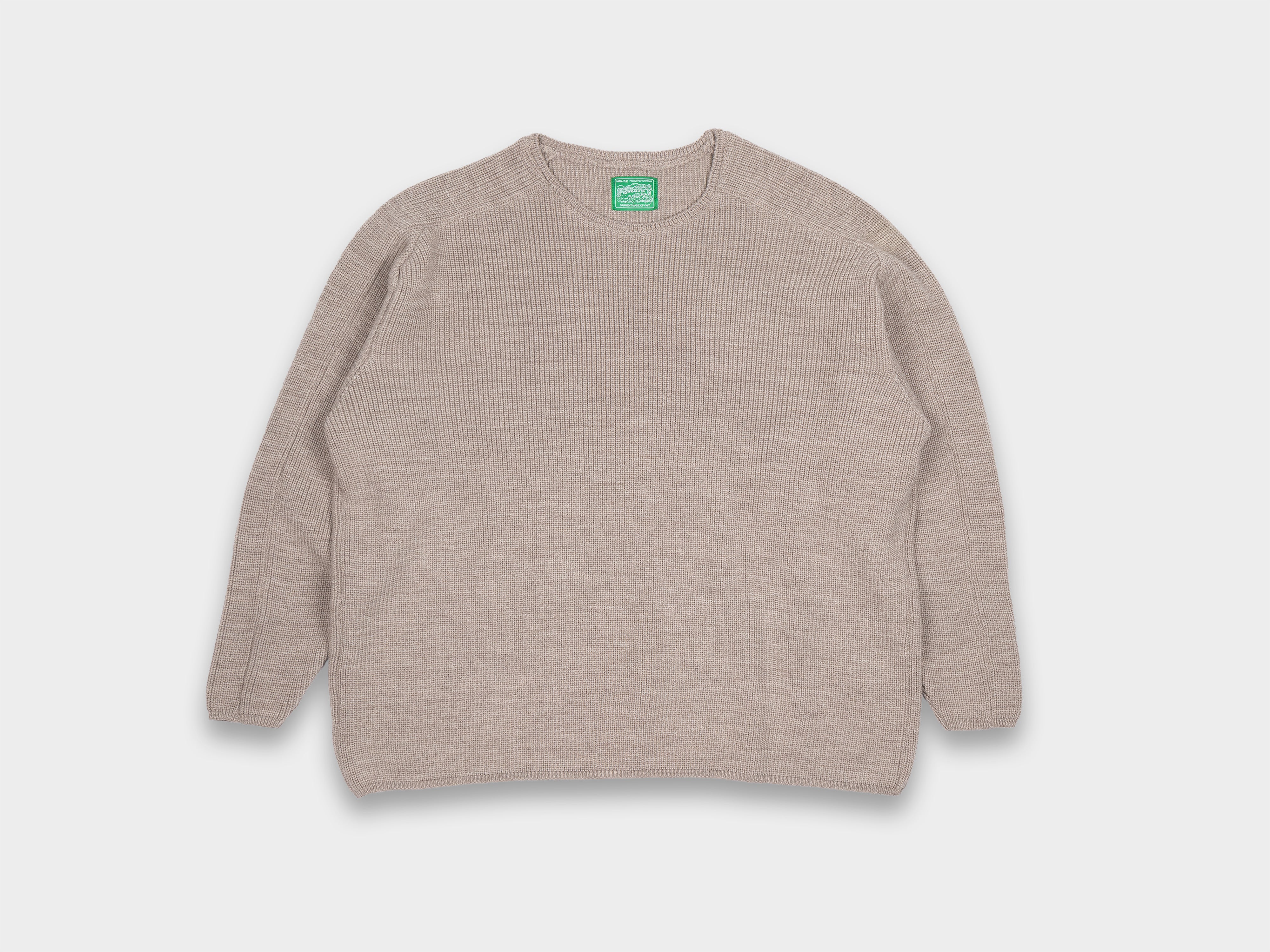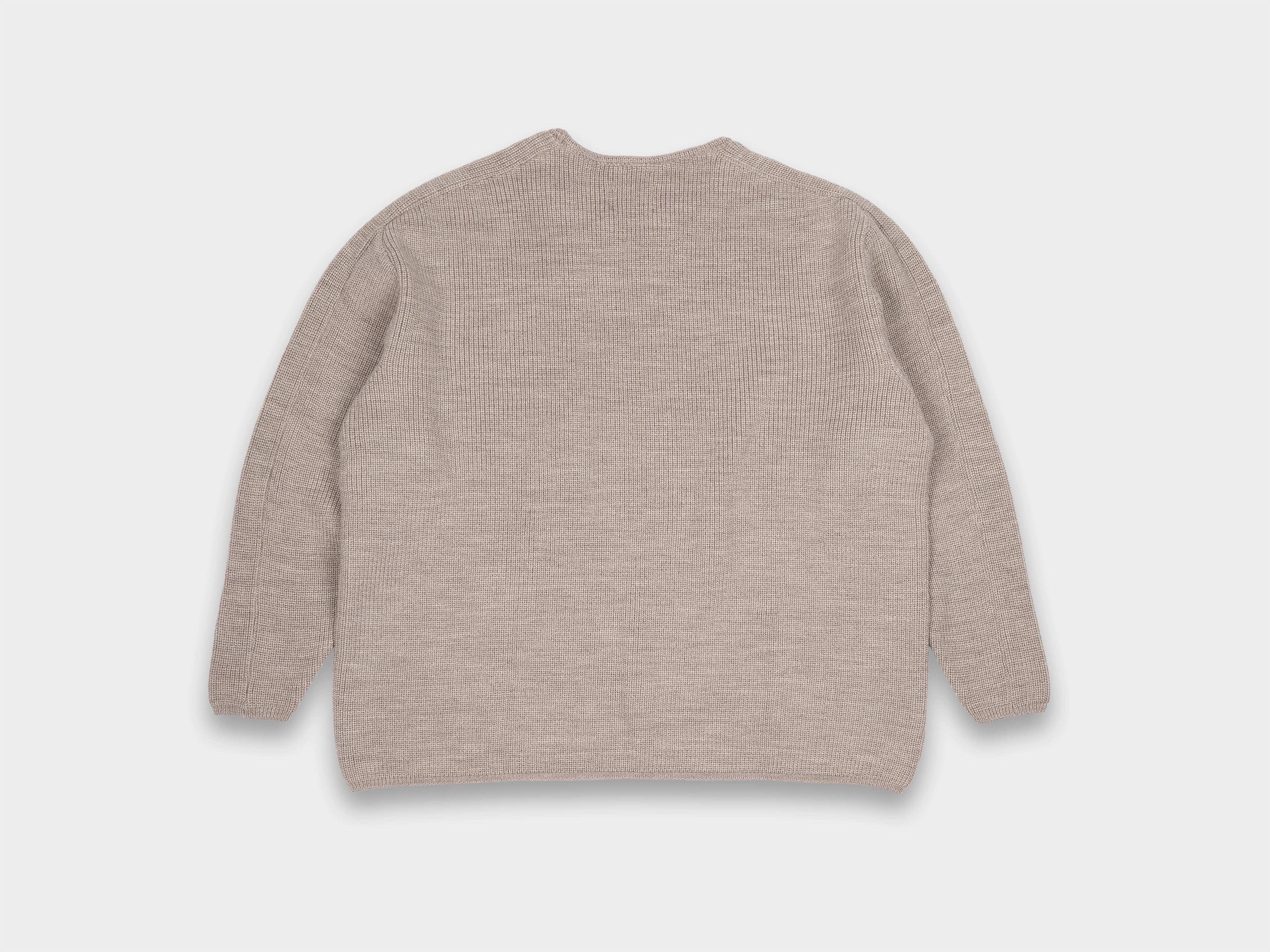 +Oversized machine knit sweater. Wide, relaxed body, knitted in an 8-gauge fisherman knit. Dropped shoulders, generous room through the armholes, long sleeves, thin ribbing at the neckline, cuffs, and hem. An experiment in production, to map the few wool suppliers and processors still operating in Australia. This garment is entirely produced in Victoria.