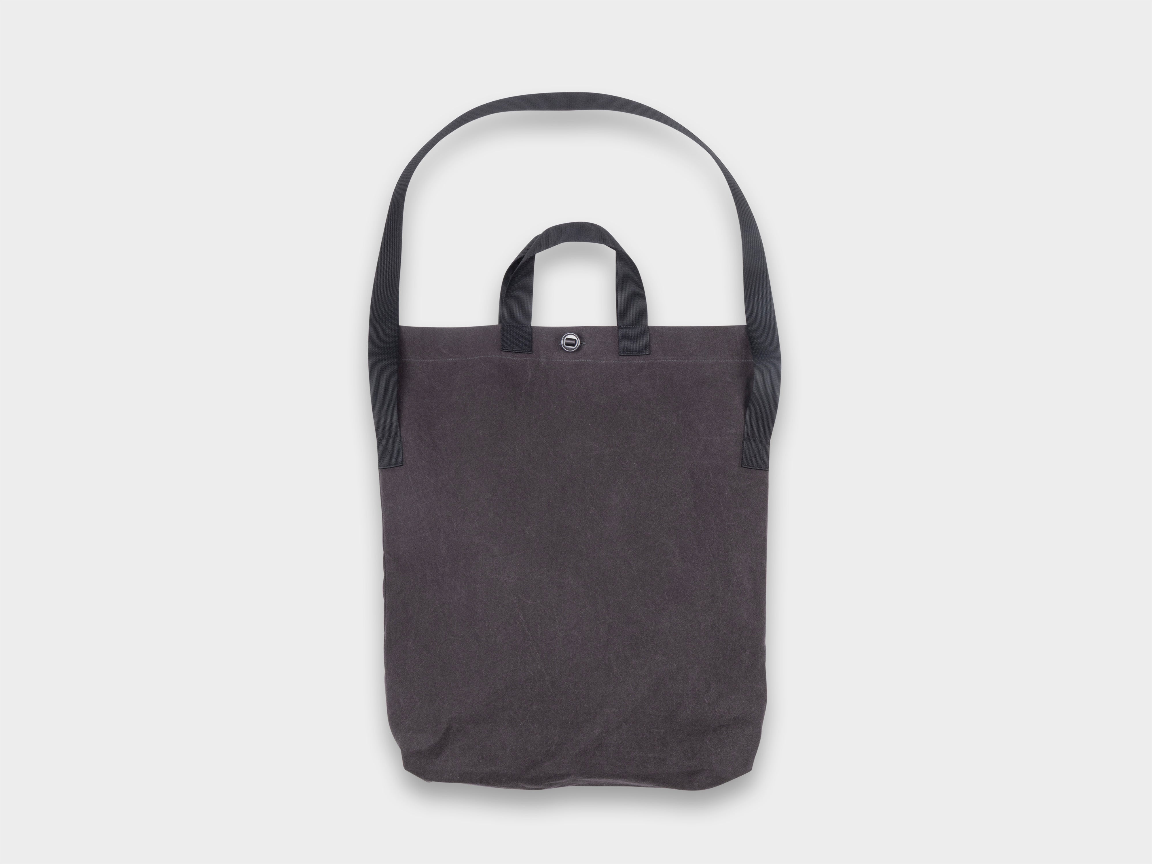 Multi-handle fold-over tote with taped slot button closure. Long shoulder strap designed to be worn crossbody. Made in Japan.