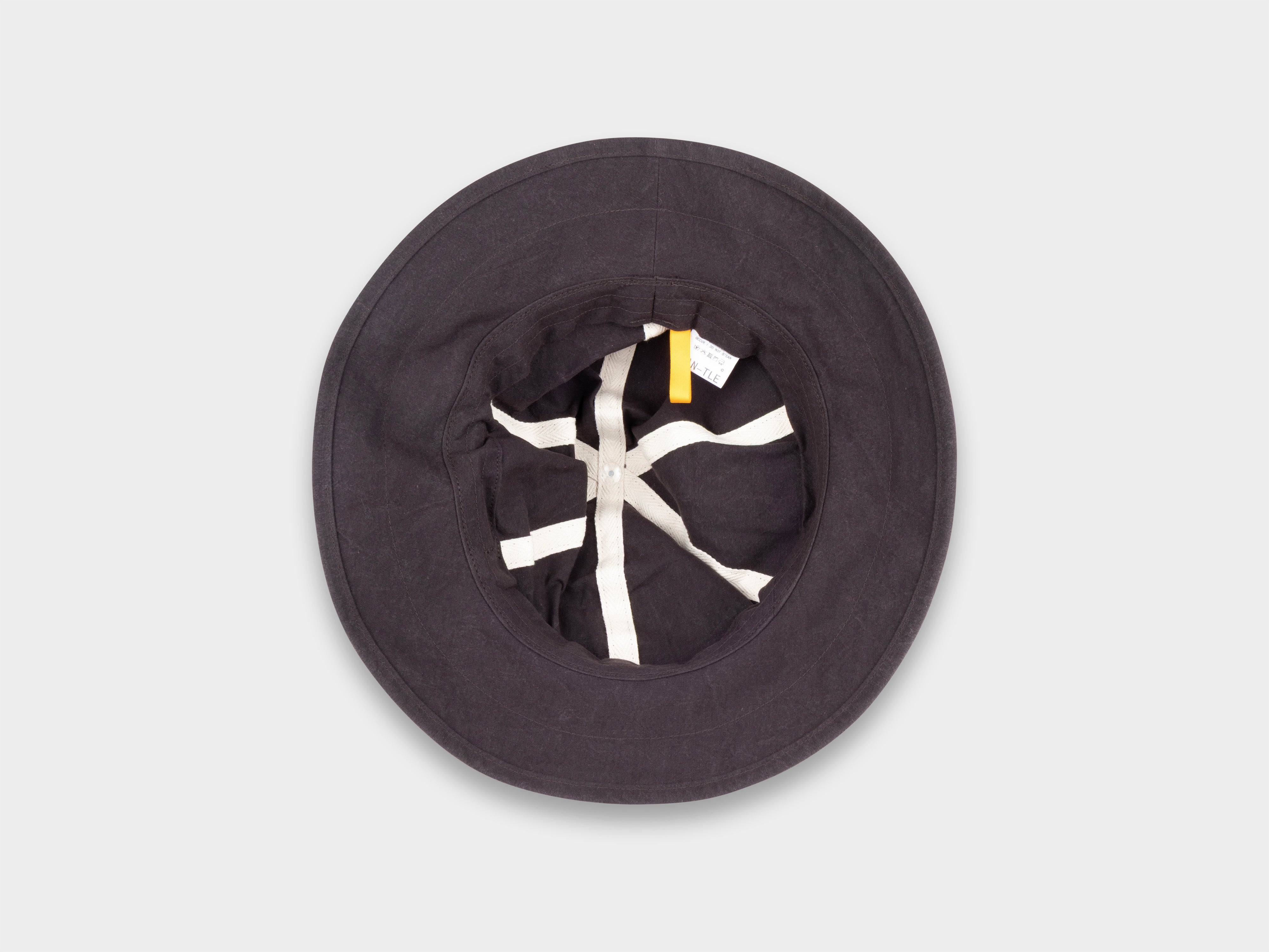 Deep-cut six panel brim hat. Slot button threaded onto seatbelt tape, used to adjust size. Cinch to distort shape. Made in Japan.