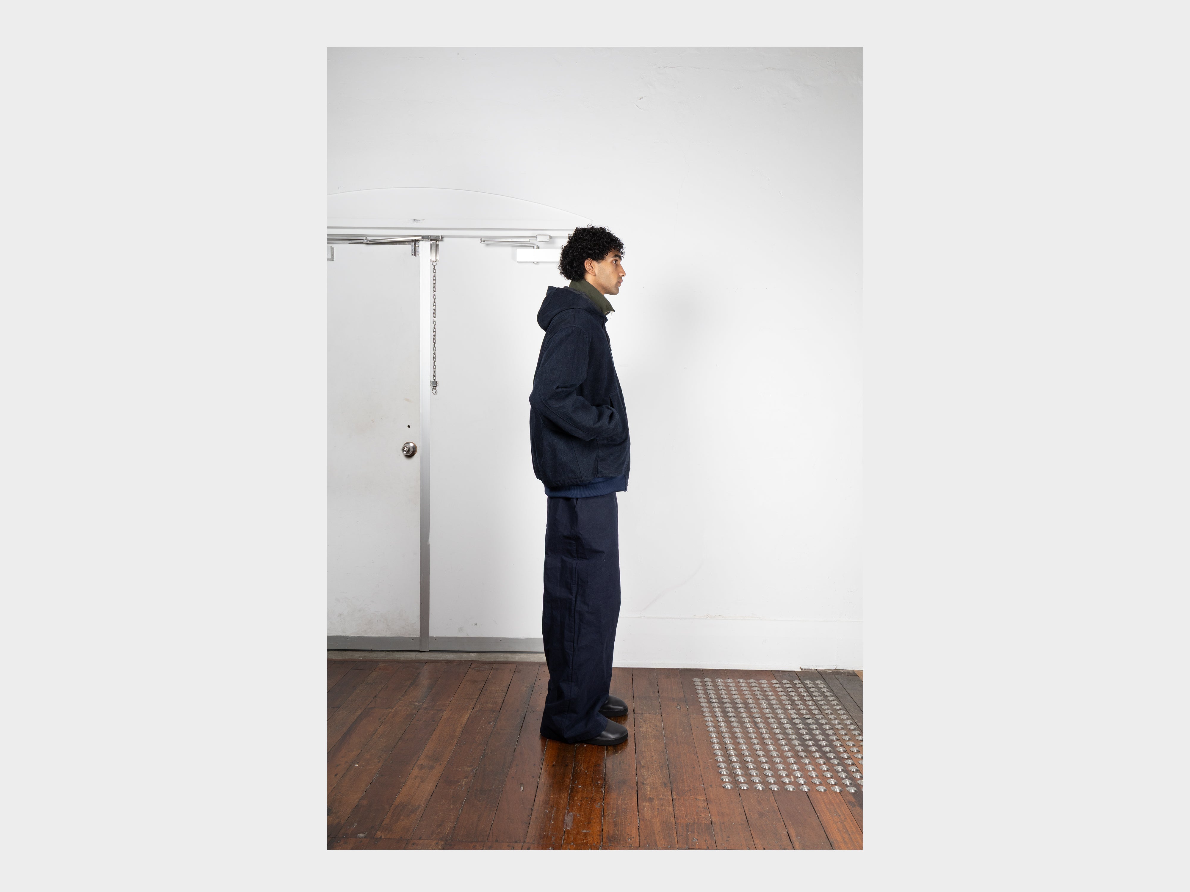 Oversized zip-up shell with drawstring hood. Wide-cut with generous room through the sleeves, large double-ended zipper, internal left chest pocket, dual hand pockets, ribbed cuffs and hem. Topstitched front facings, double-stitched welted seams. Made in Japan.