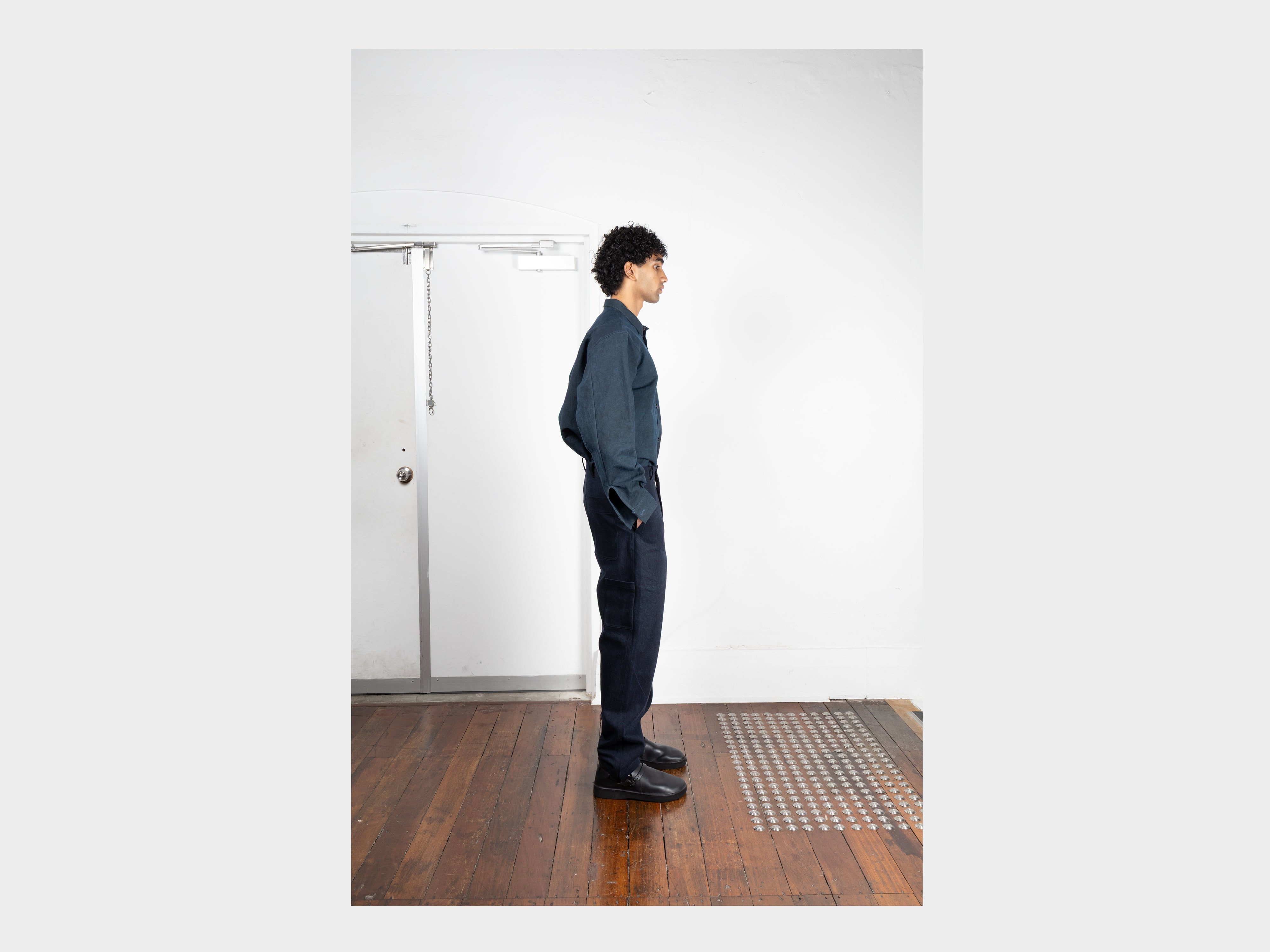 +100% organic cotton. Yarn-dyed denim, woven in Hiroshima, bio-washed, then overdyed by hand in Okayama using a combination of binchotan charcoal and sumi (ink). Ubame Oak is carbonised over several days to produce high-purity binchotan, known for its antibacterial and neutralising qualities, then ground into natural pigment. Combined with sumi, it imparts subtle tonal variation that evolves with washing and wear. Dyed at a small-scale mill of just two people, colour consistency is achieved through careful hand and eye. Produced for MAN–TLE in Hiroshima, Japan.