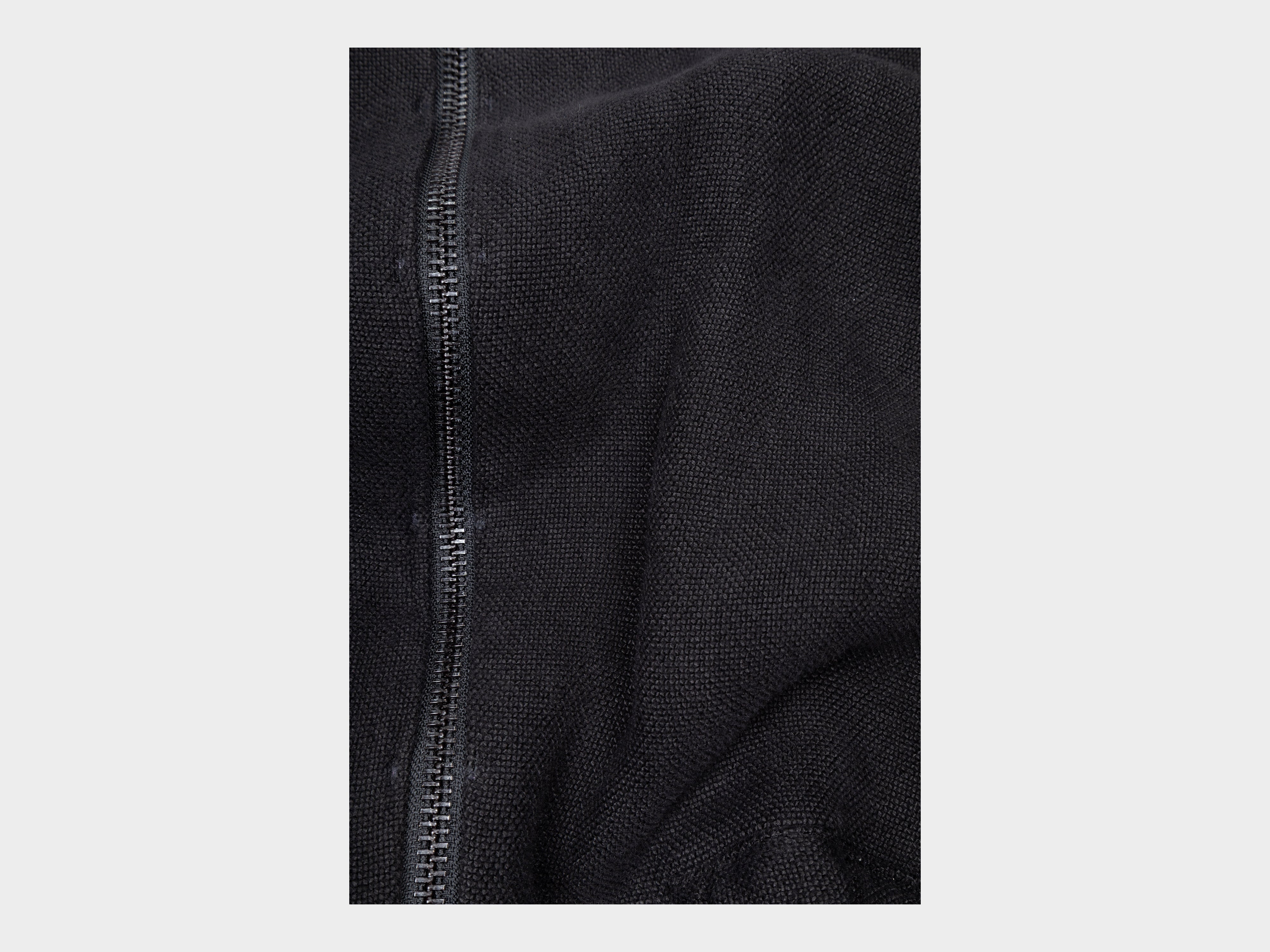 +100% linen. Heavyweight oil painter's canvas, woven in Kyoto and bio-washed for 20 hours before being overdyed deep black. The yarns soften and swell, revealing the plain weave and producing a soft, fibrous texture. Woven in Kyoto, Japan. Produced for MAN–TLE.