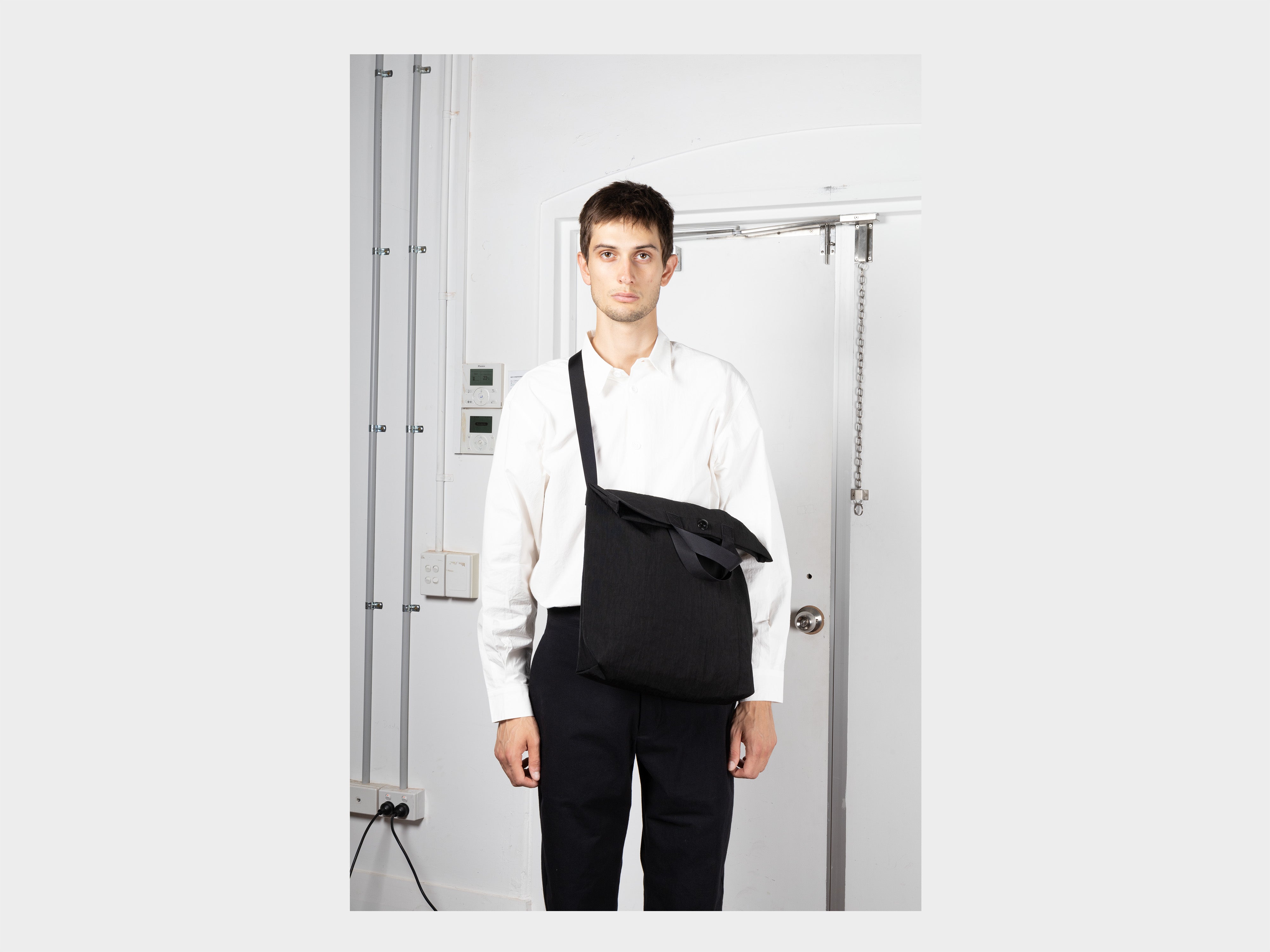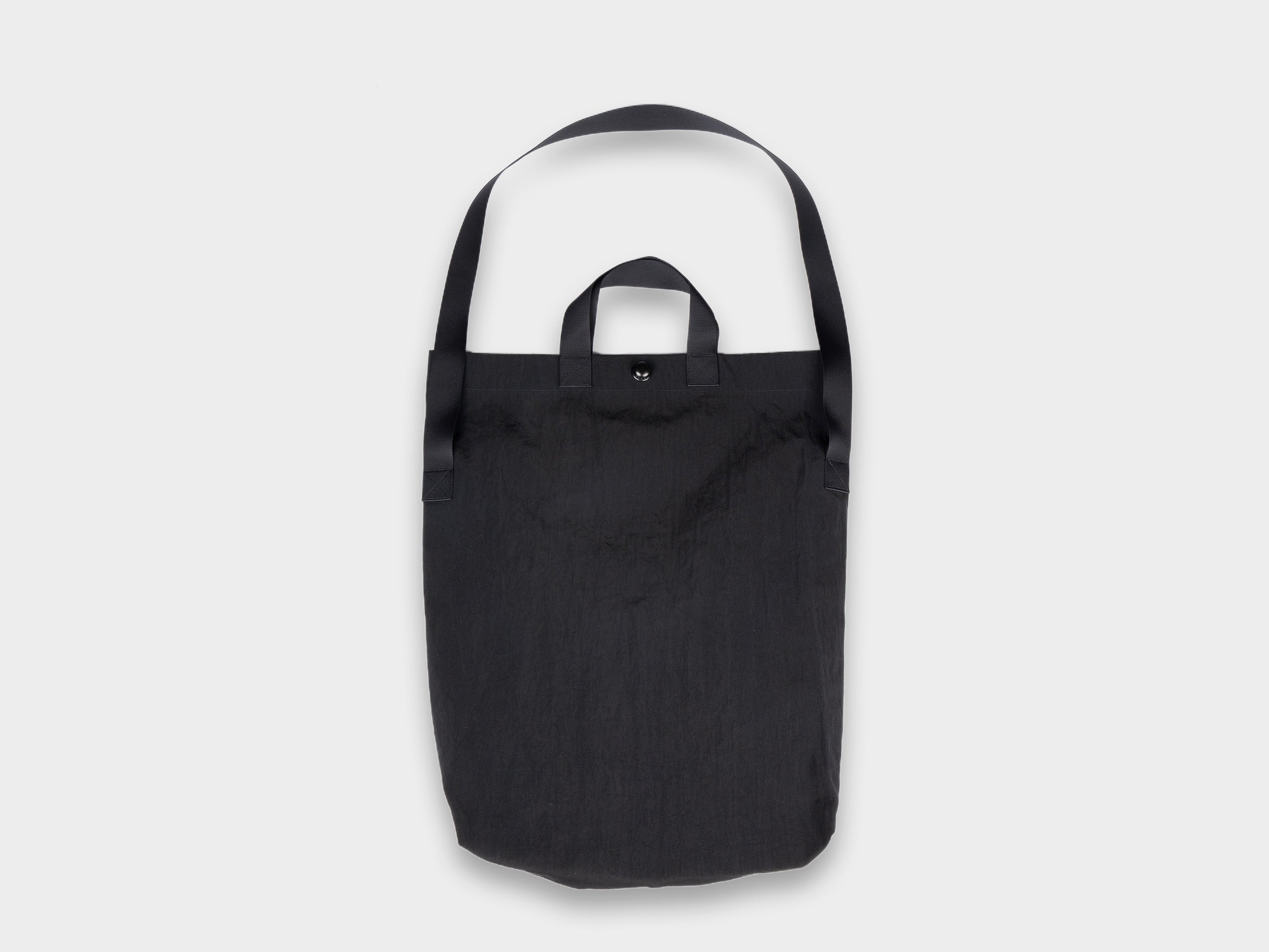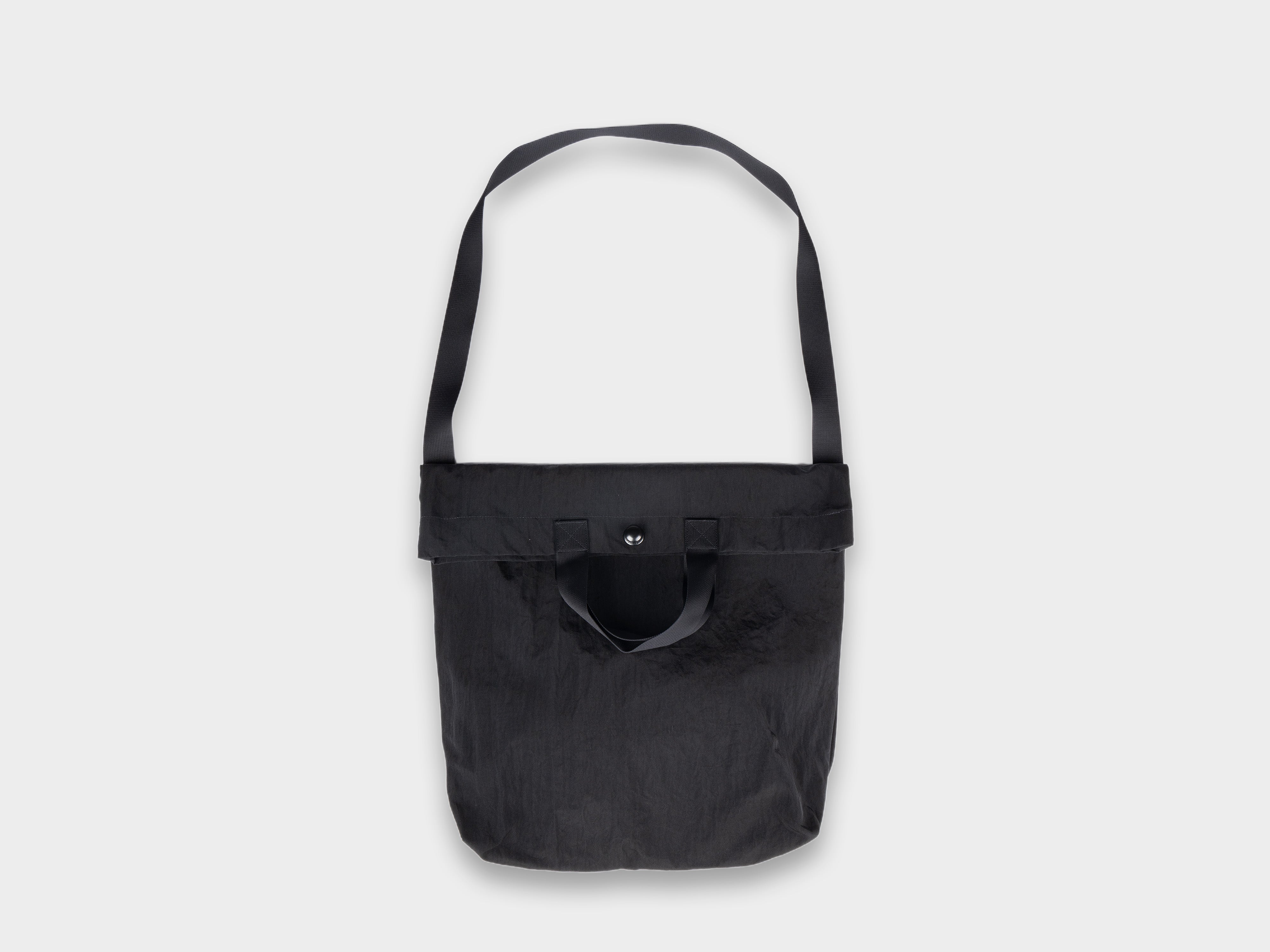 +Fold-over tote with snap hardware closure, two short handles, and single long shoulder strap designed to be worn crossbody. Made in Japan.