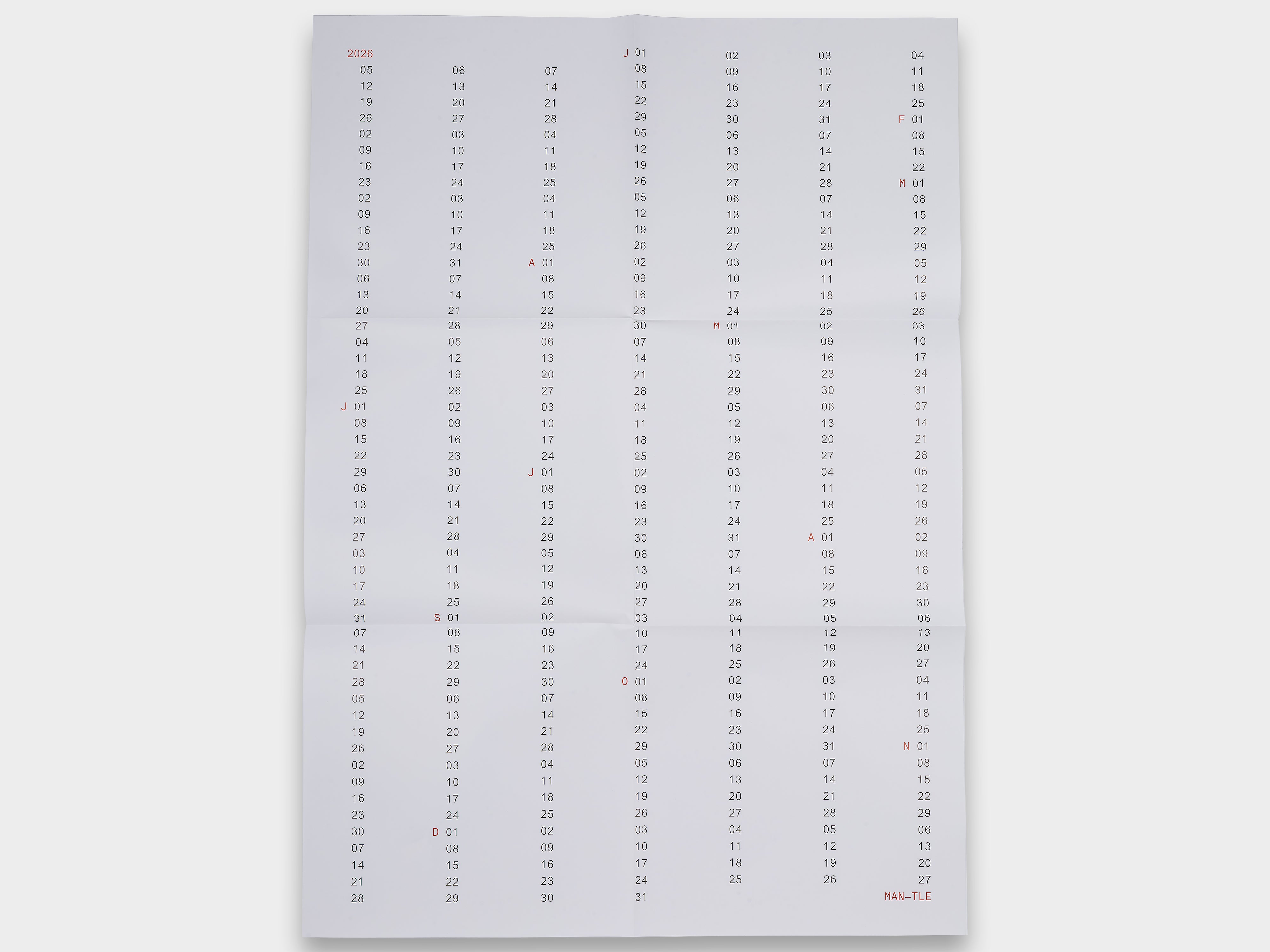 Large–format wall calendar with a utilitarian layout showing all 365 days on a single sheet for quick, at–a–glance reference throughout the year. Designed for MAN–TLE by TRiC Studio and printed in Western Australia.