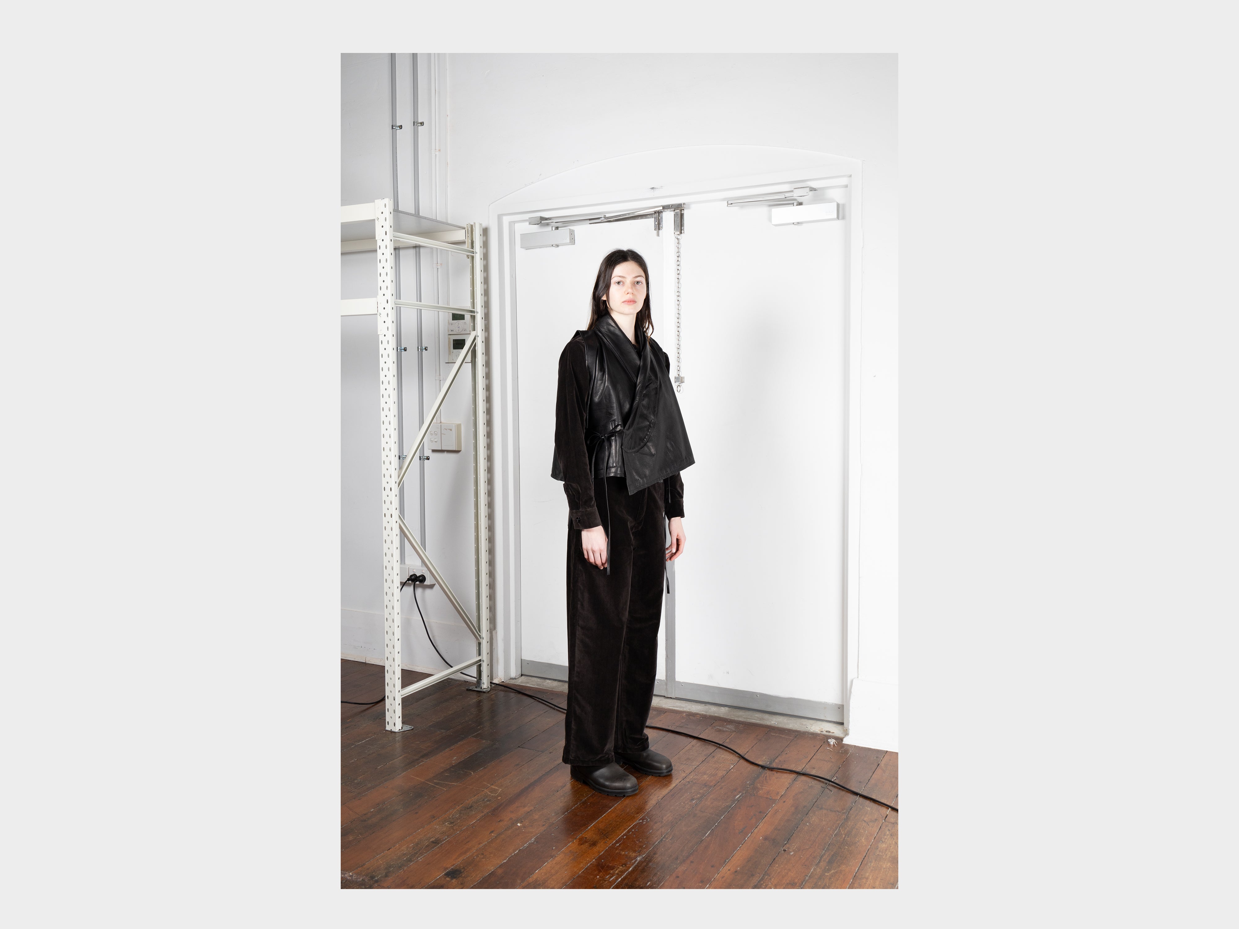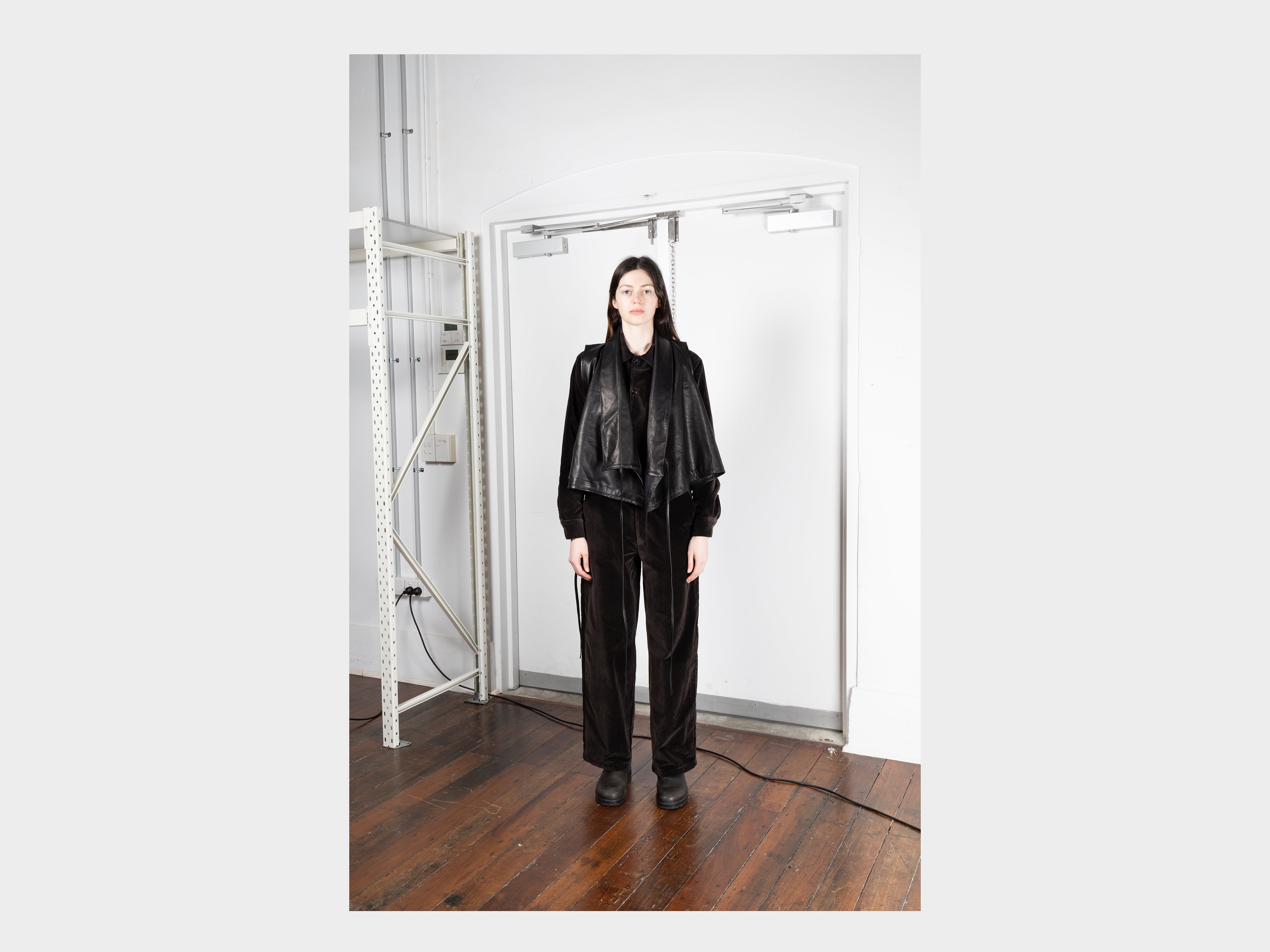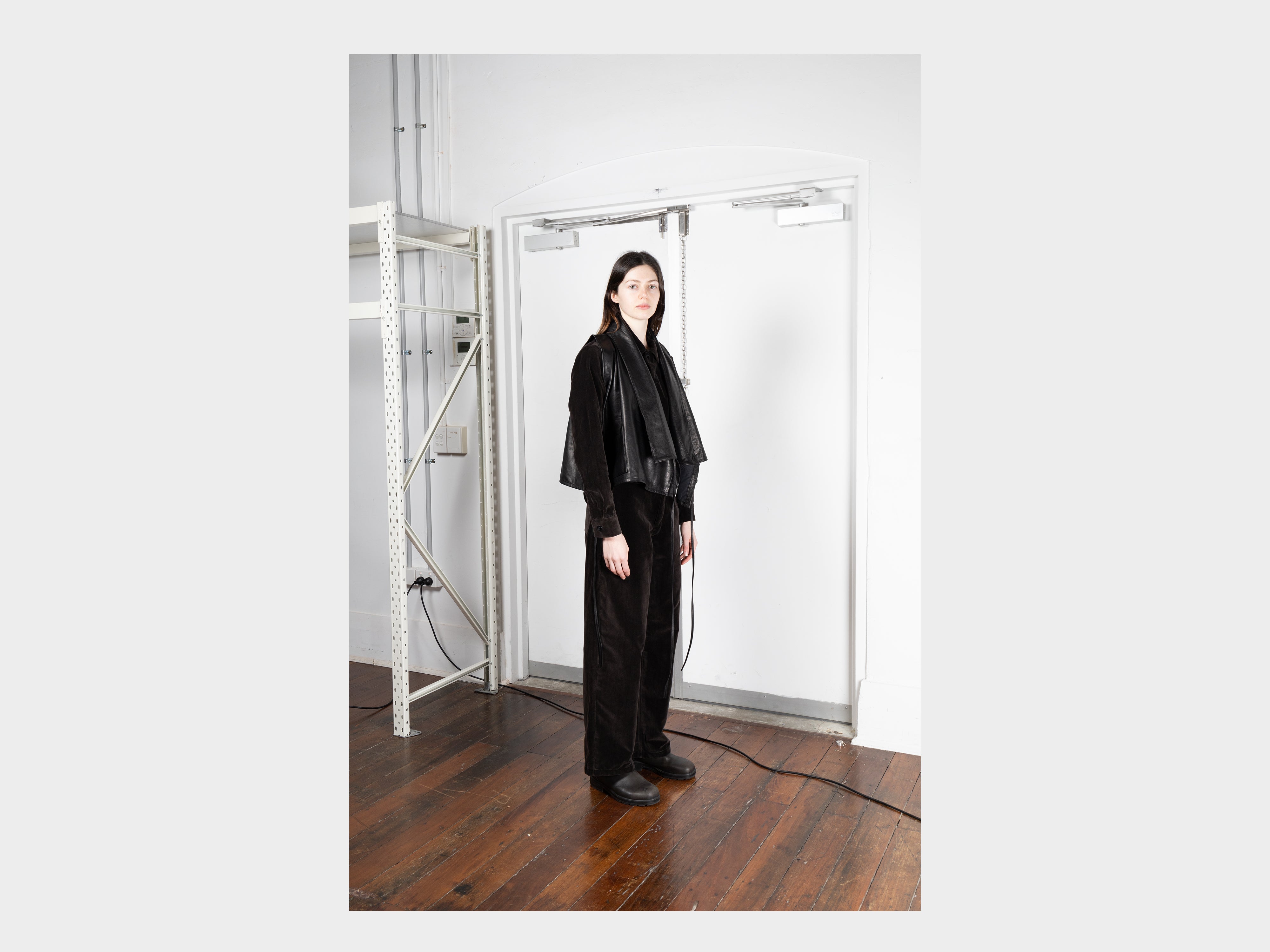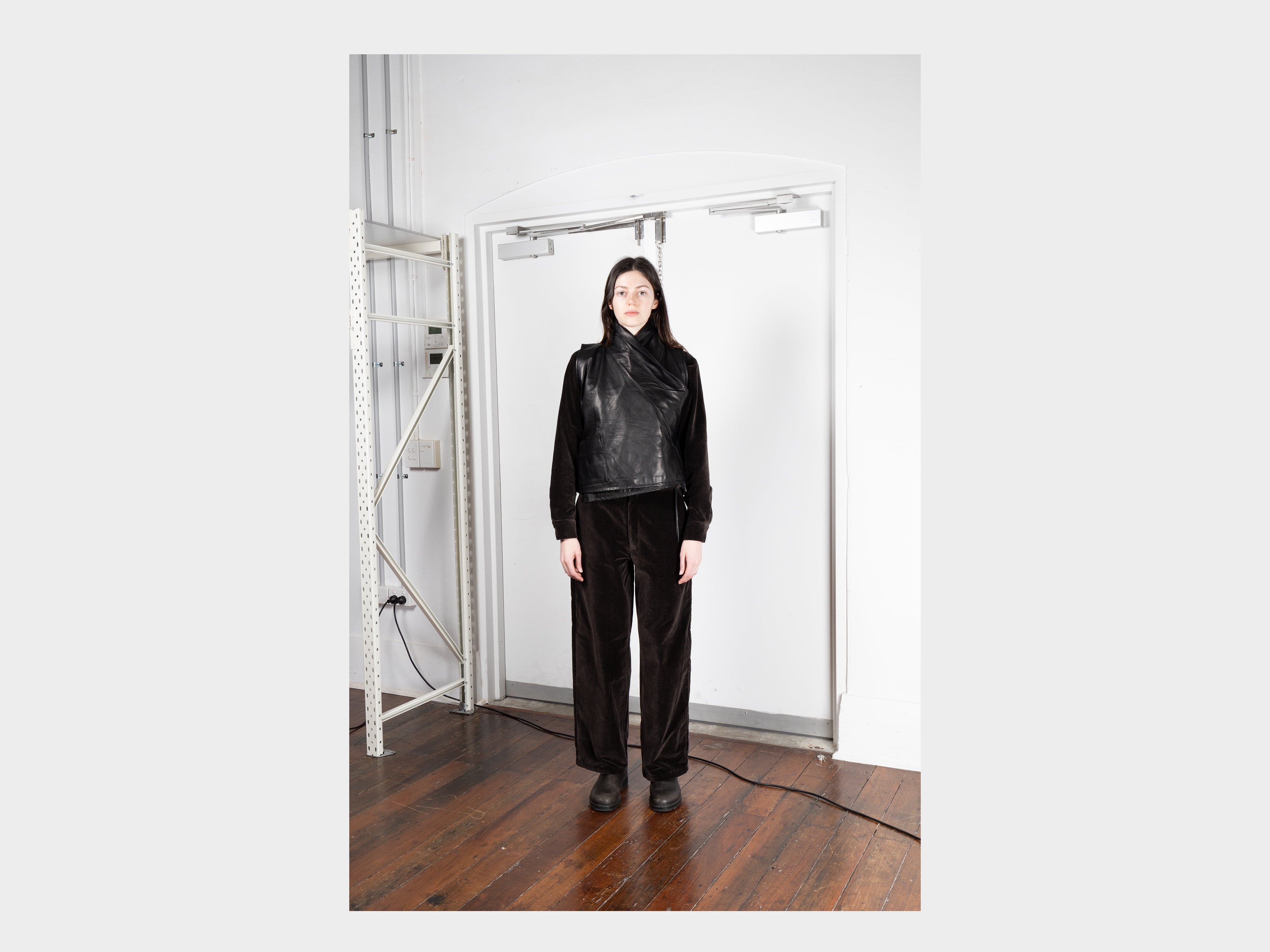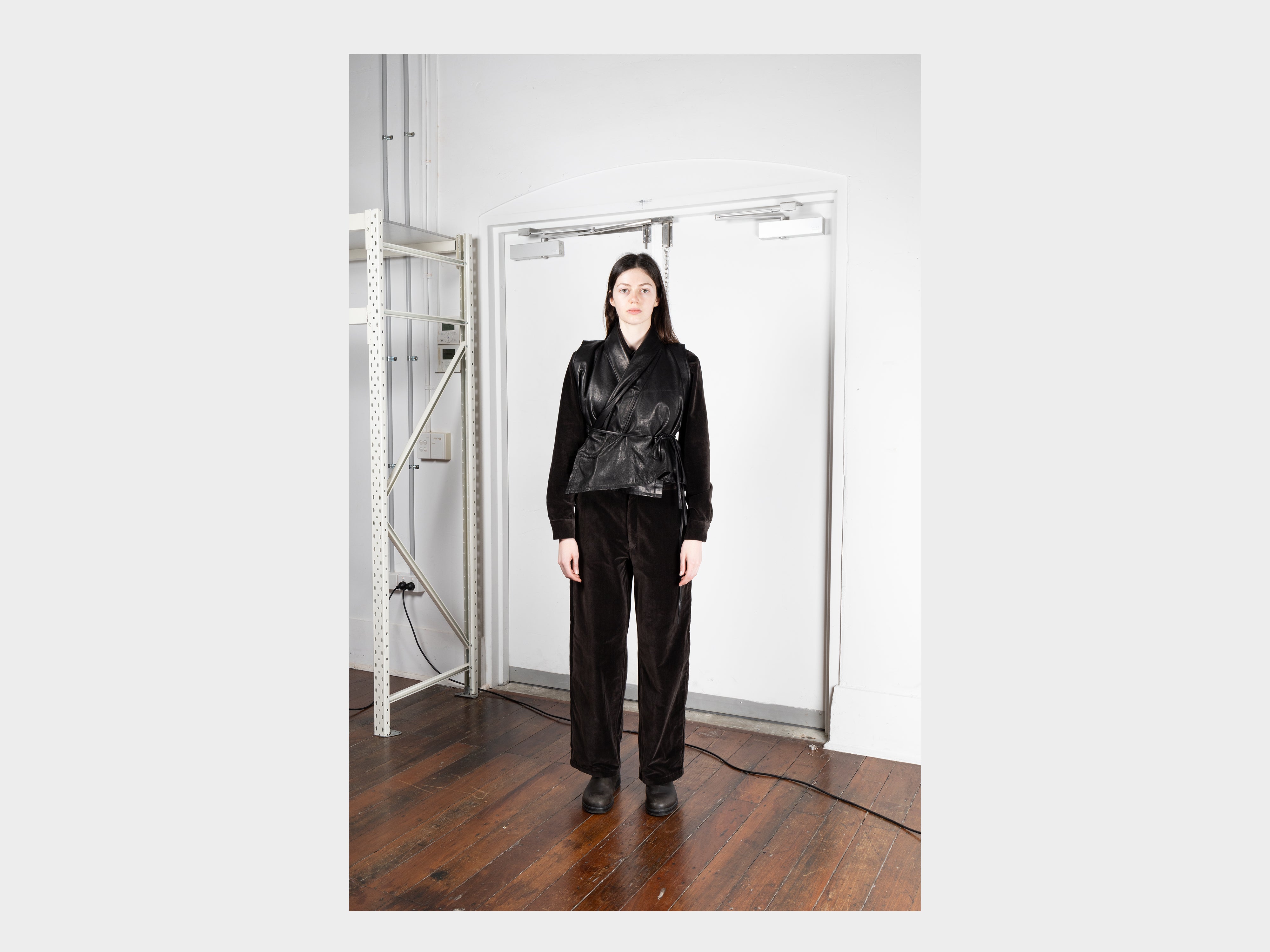 +Wrap-top derived from a Korean Jeogori, can be tied in multiple ways. Wrap collar, patch pocket at right hip, leather ties, internal lining. Finished with flat seams. Made in Japan.