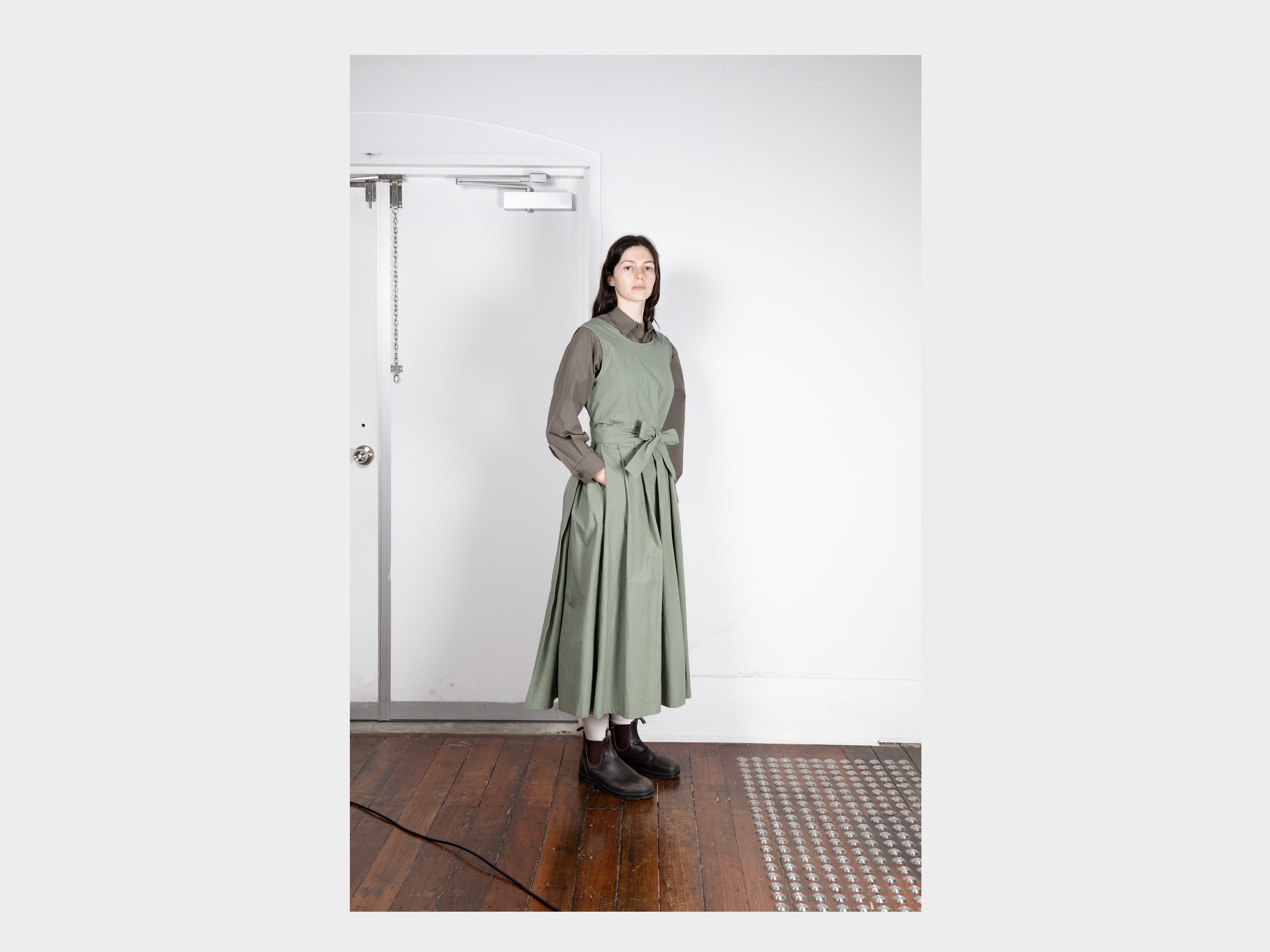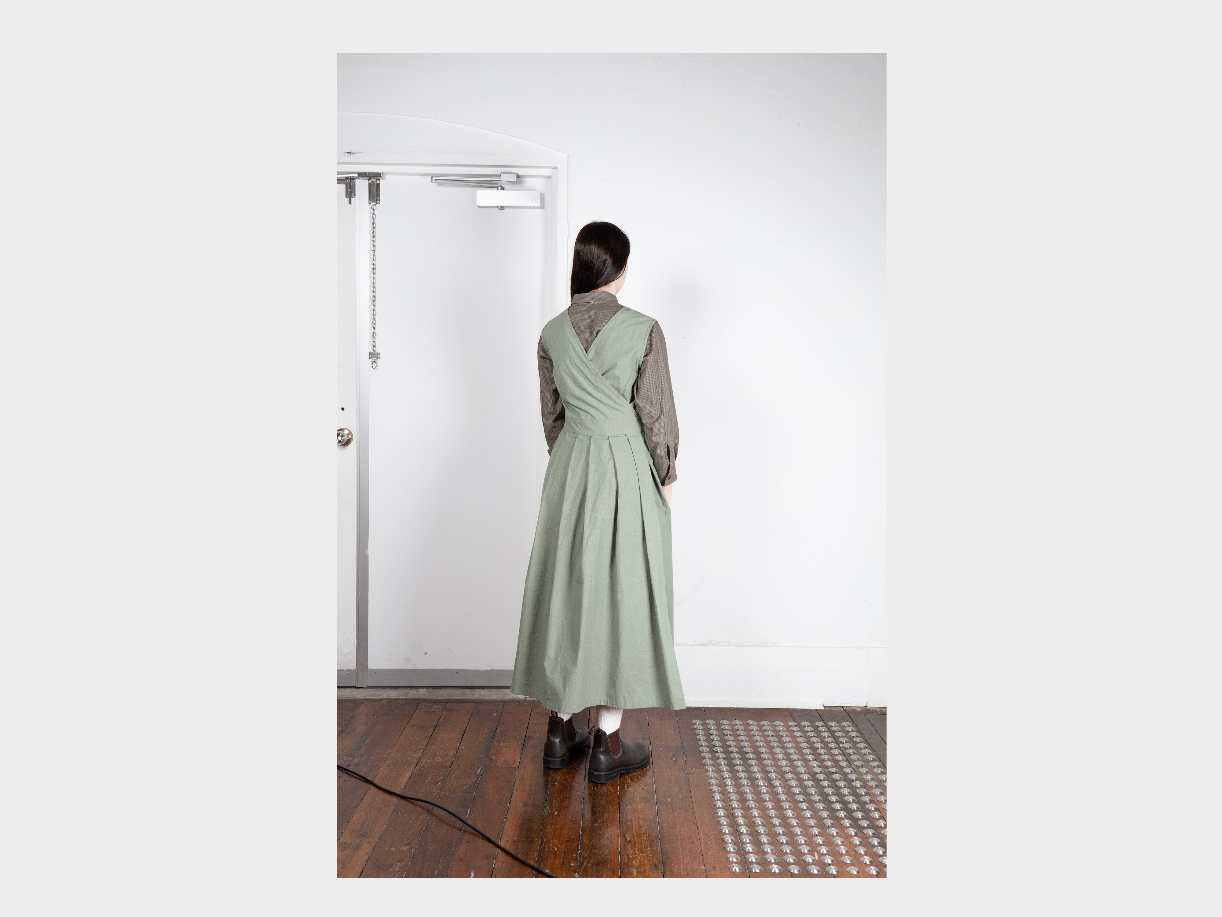 +Sleeveless wrap-dress based on a traditional Korean workwear apron. A wide-pleated skirt adds volume and weight to the silhouette. With no hardware, this dress ties around the body offering easy sizing and the option to wear solo, or layered over other garments. Made in Japan.