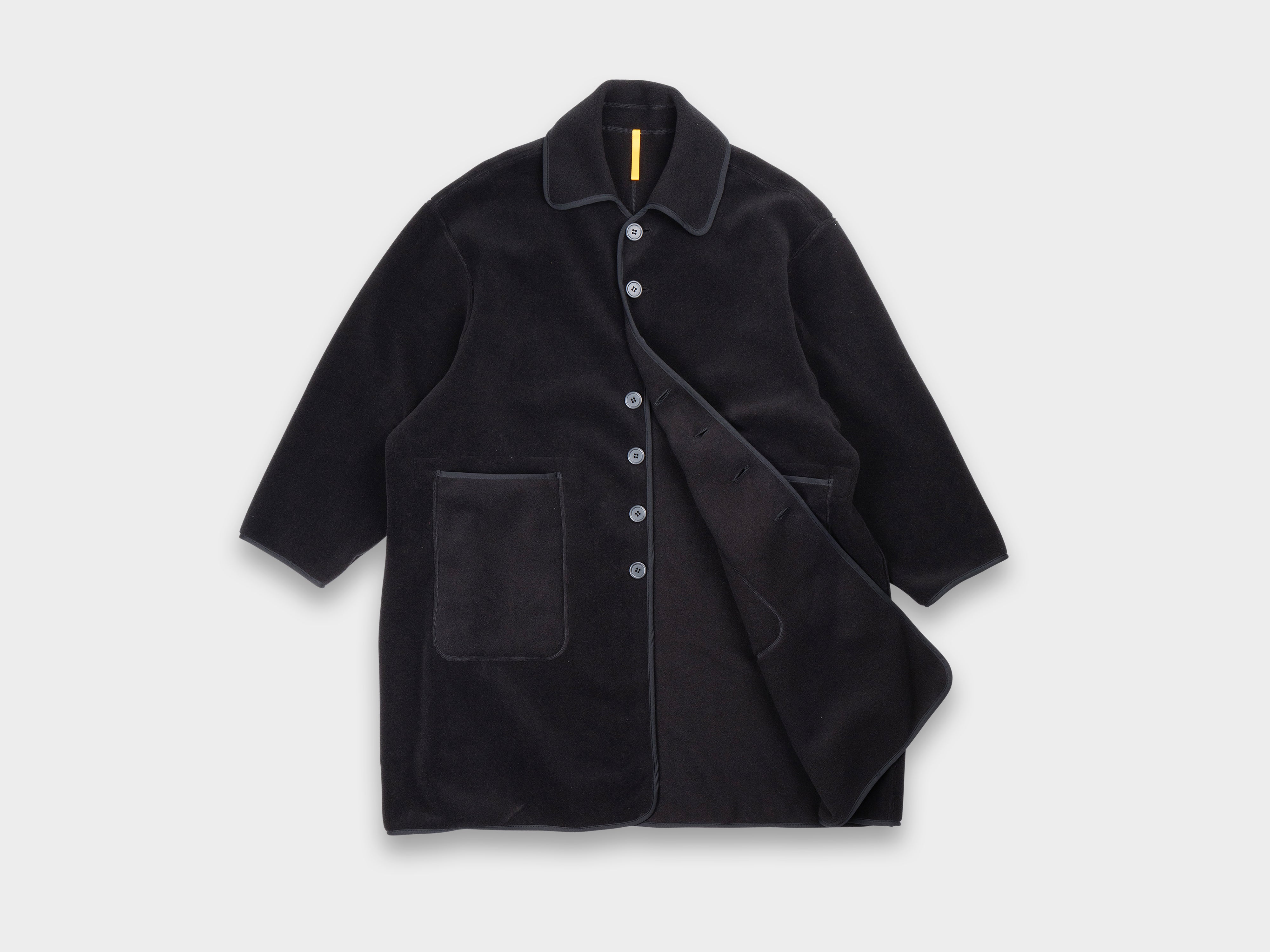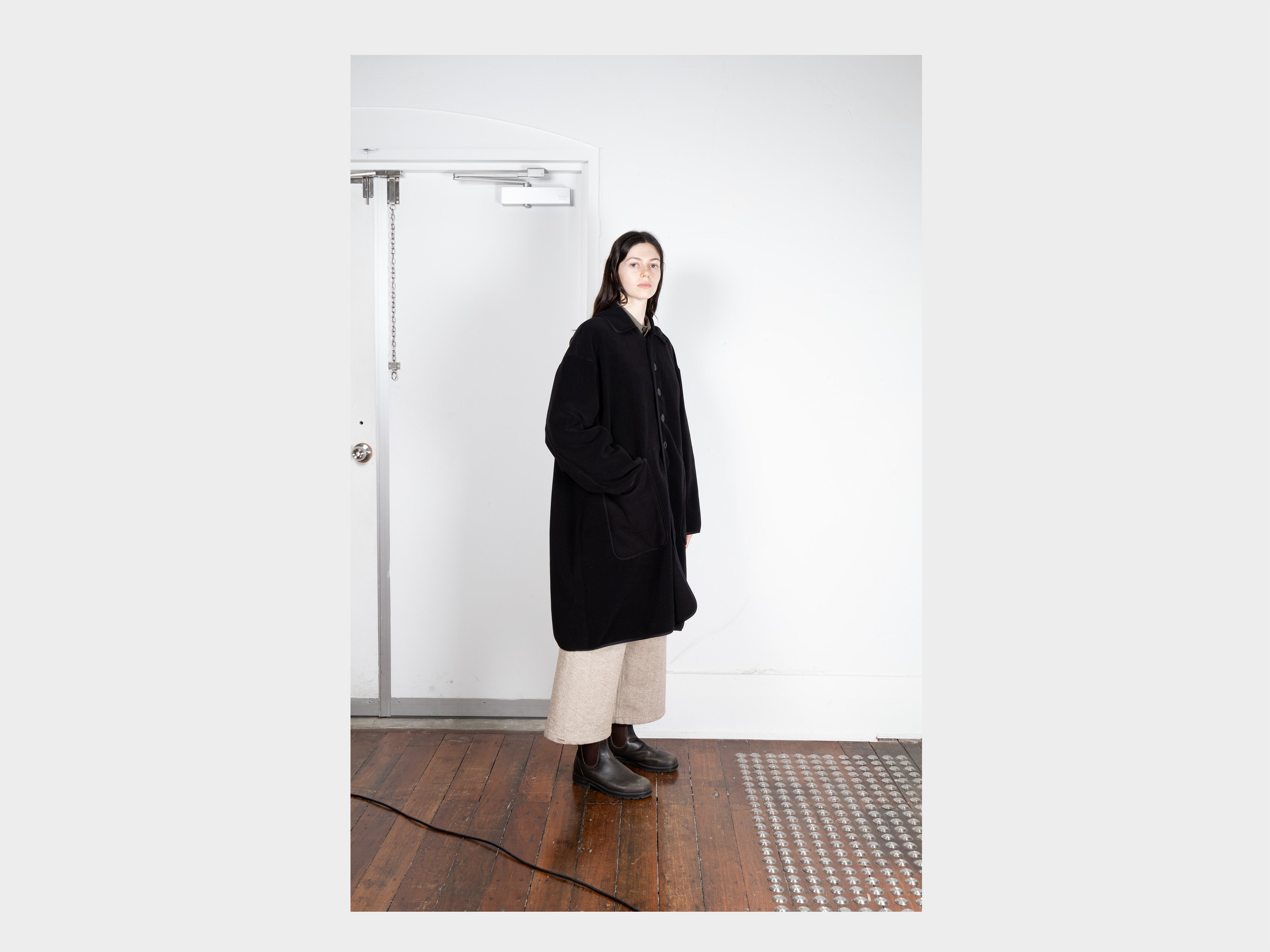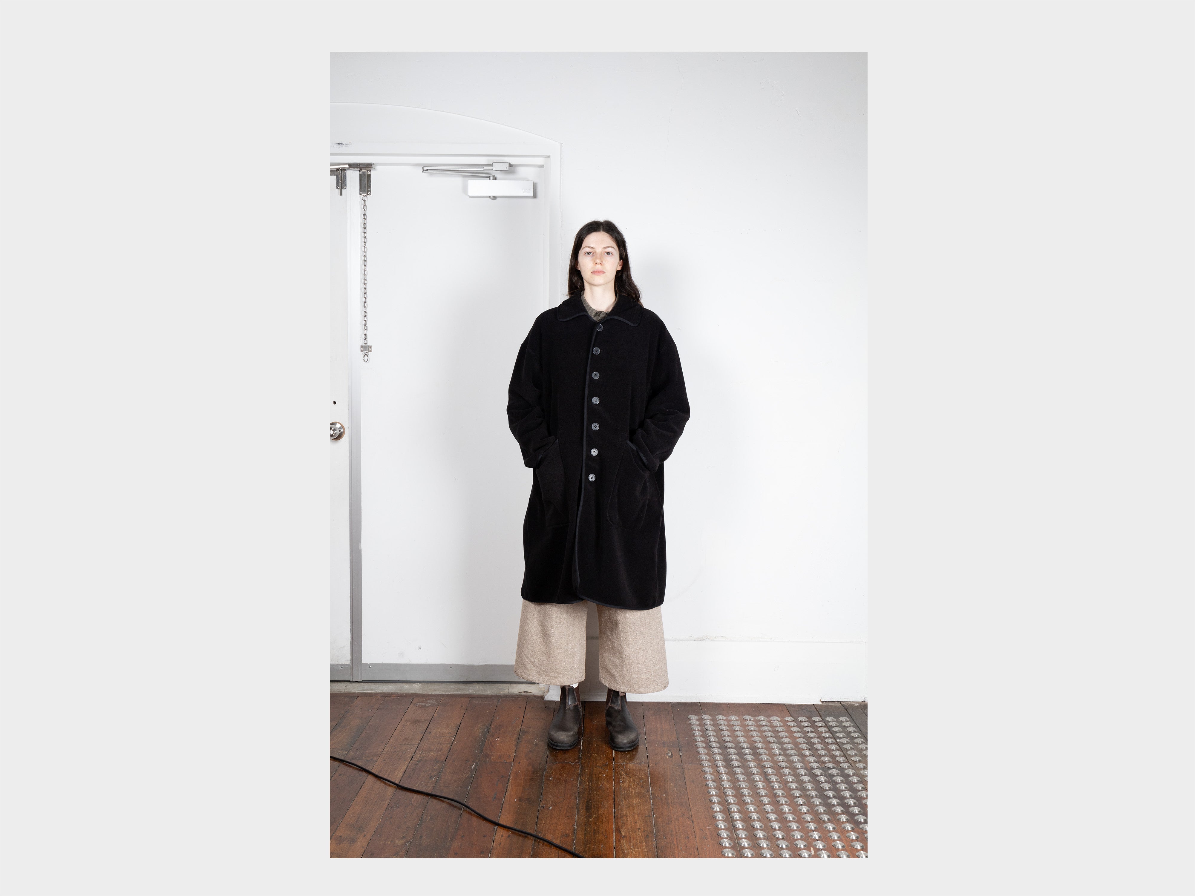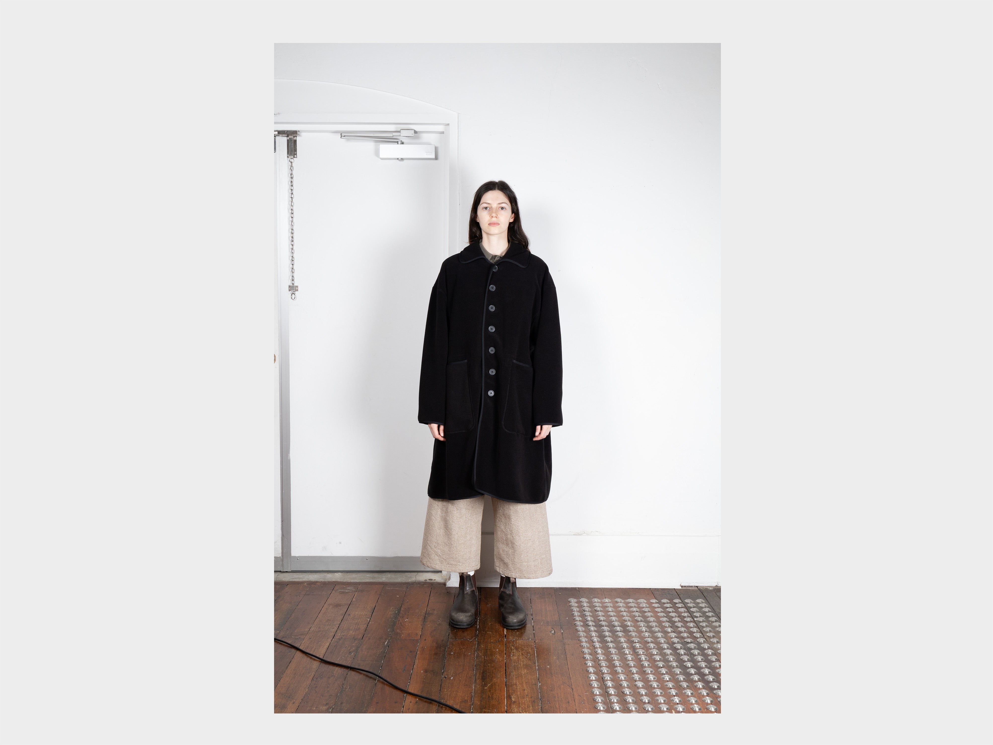 +Relaxed-fit Balmacaan coat. Generous sleeves and body, curved collar, button front, reinforced front patch pockets. All edges are self-bound. Made in Japan.