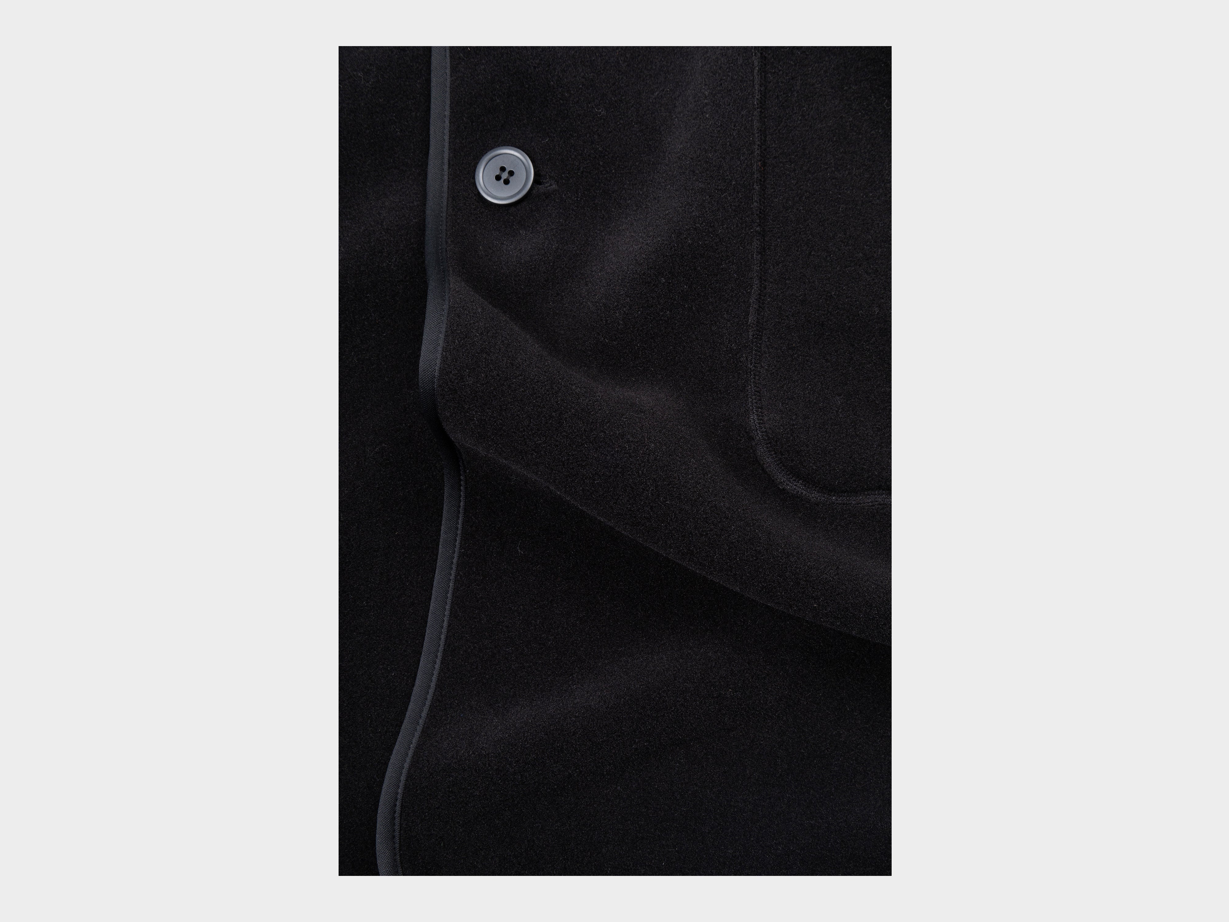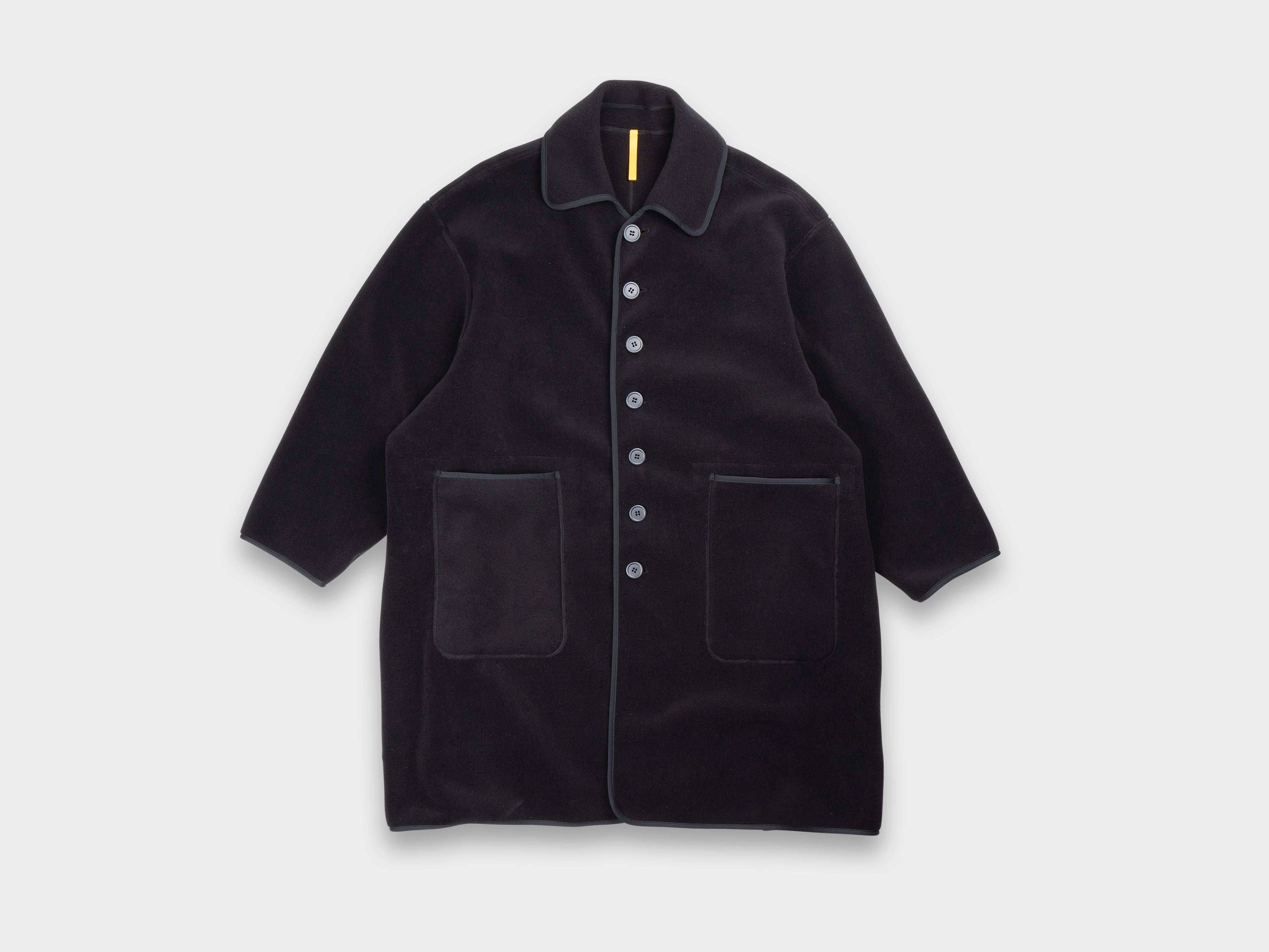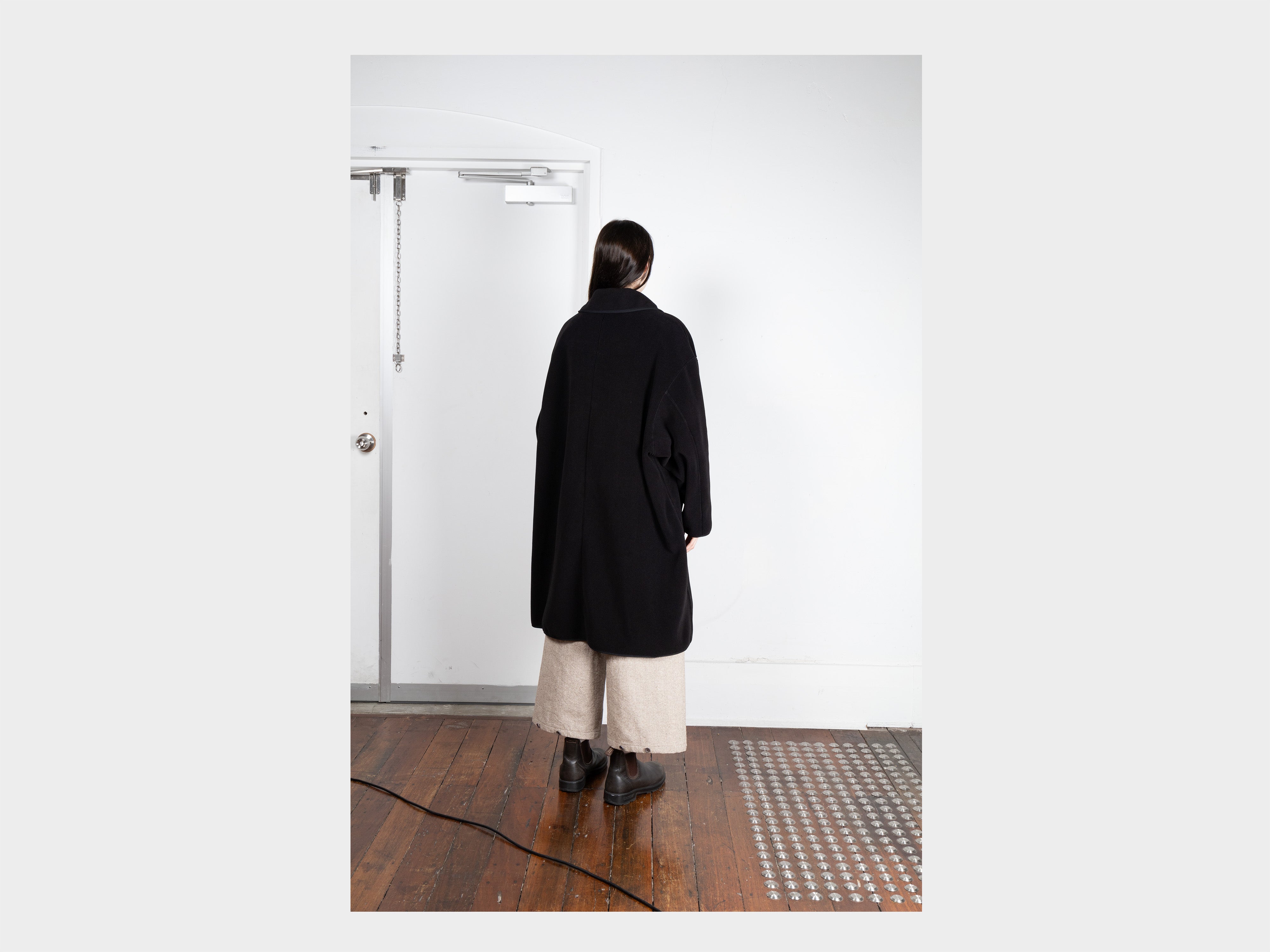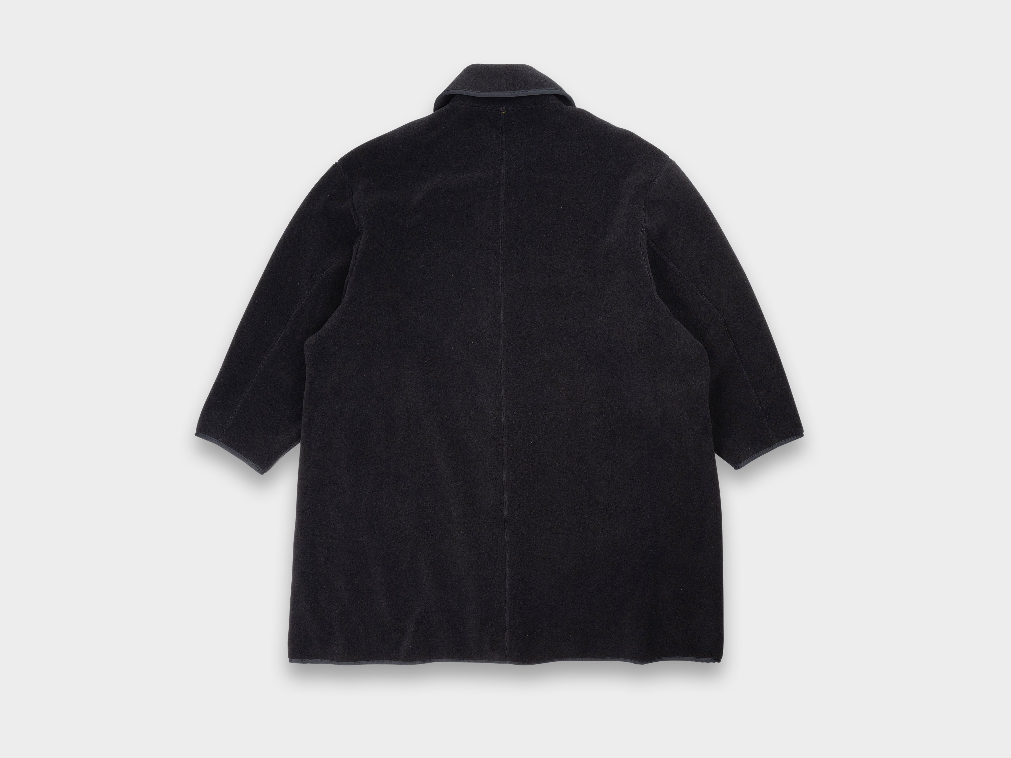+Relaxed-fit Balmacaan coat. Generous sleeves and body, curved collar, button front, reinforced front patch pockets. All edges are self-bound. Made in Japan.
