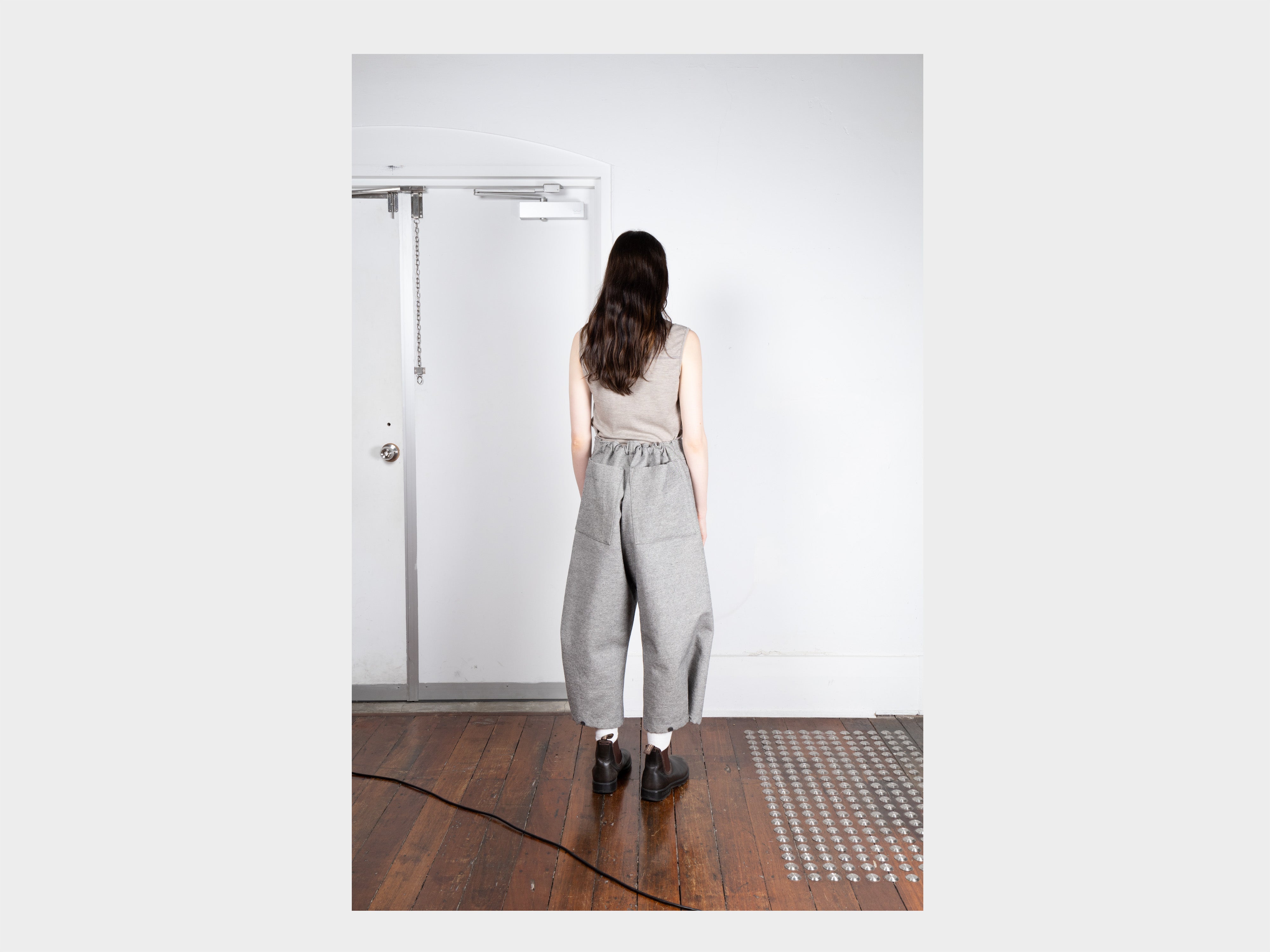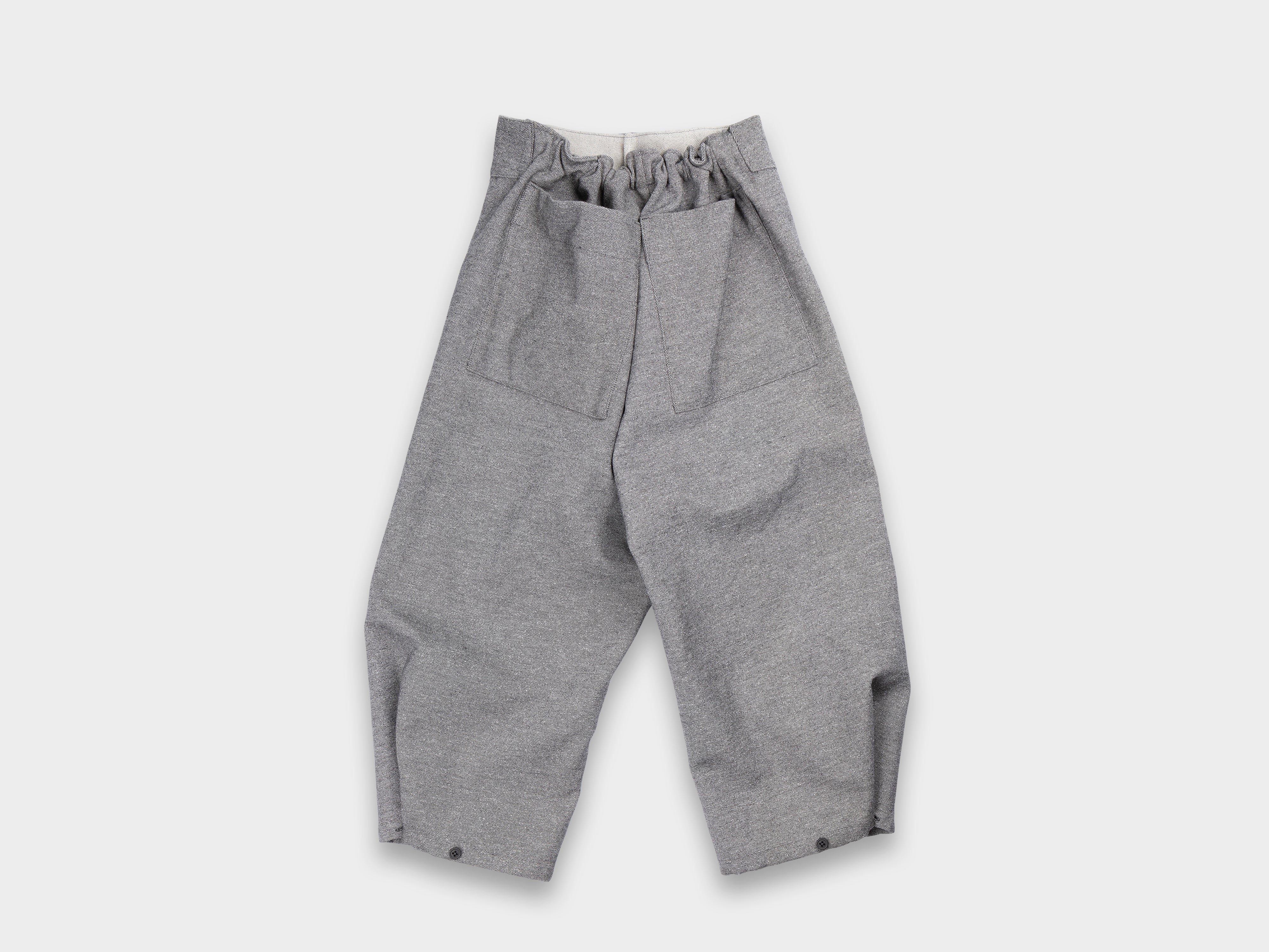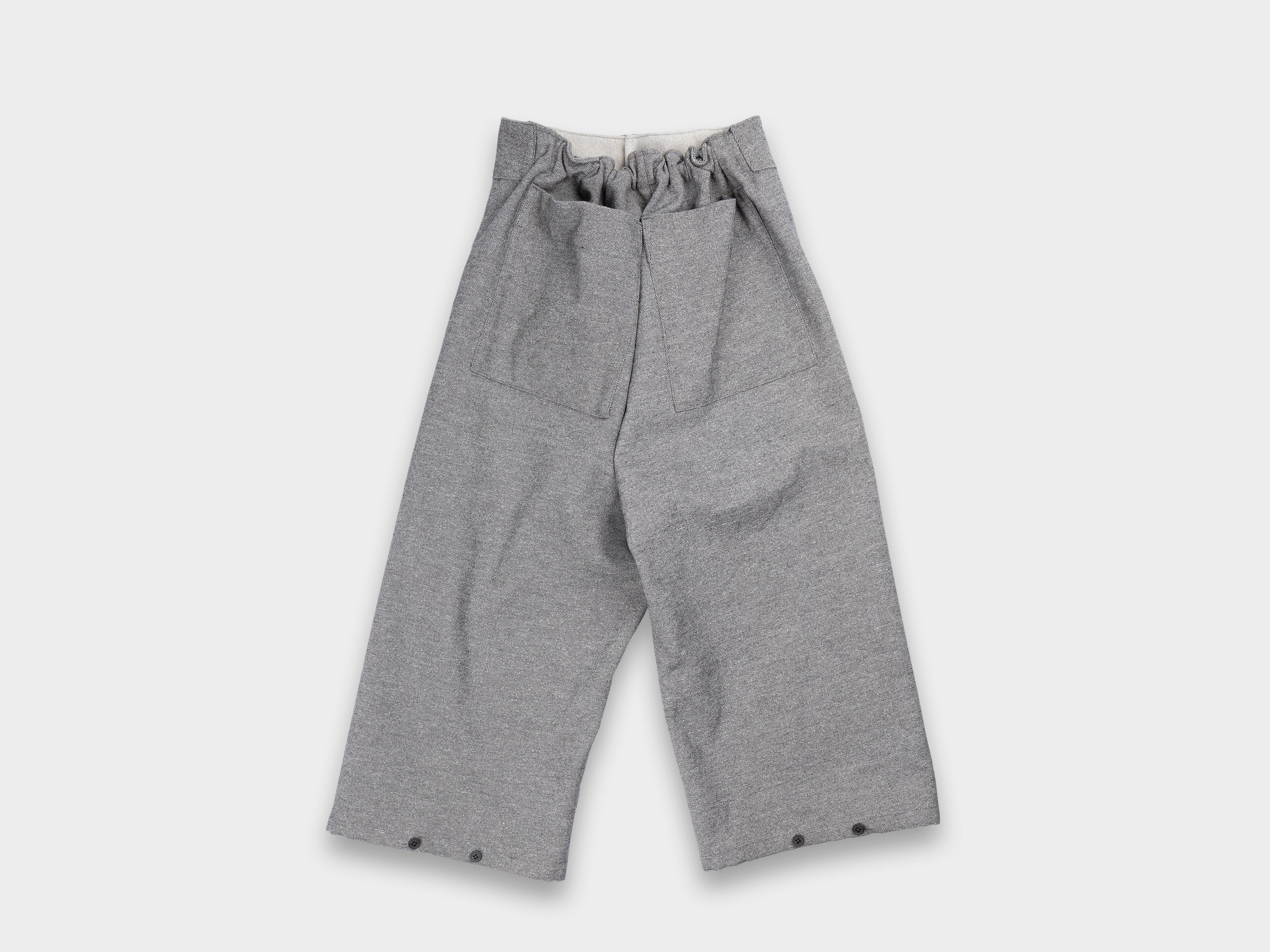 +Wide leg, flat front easy pants for women. Long crotch and generous leg, rear waistband includes elastic. Two large patch pockets on the rear give this garment its name. Buttons on hem can be used to cinch the leg. Made in Japan.