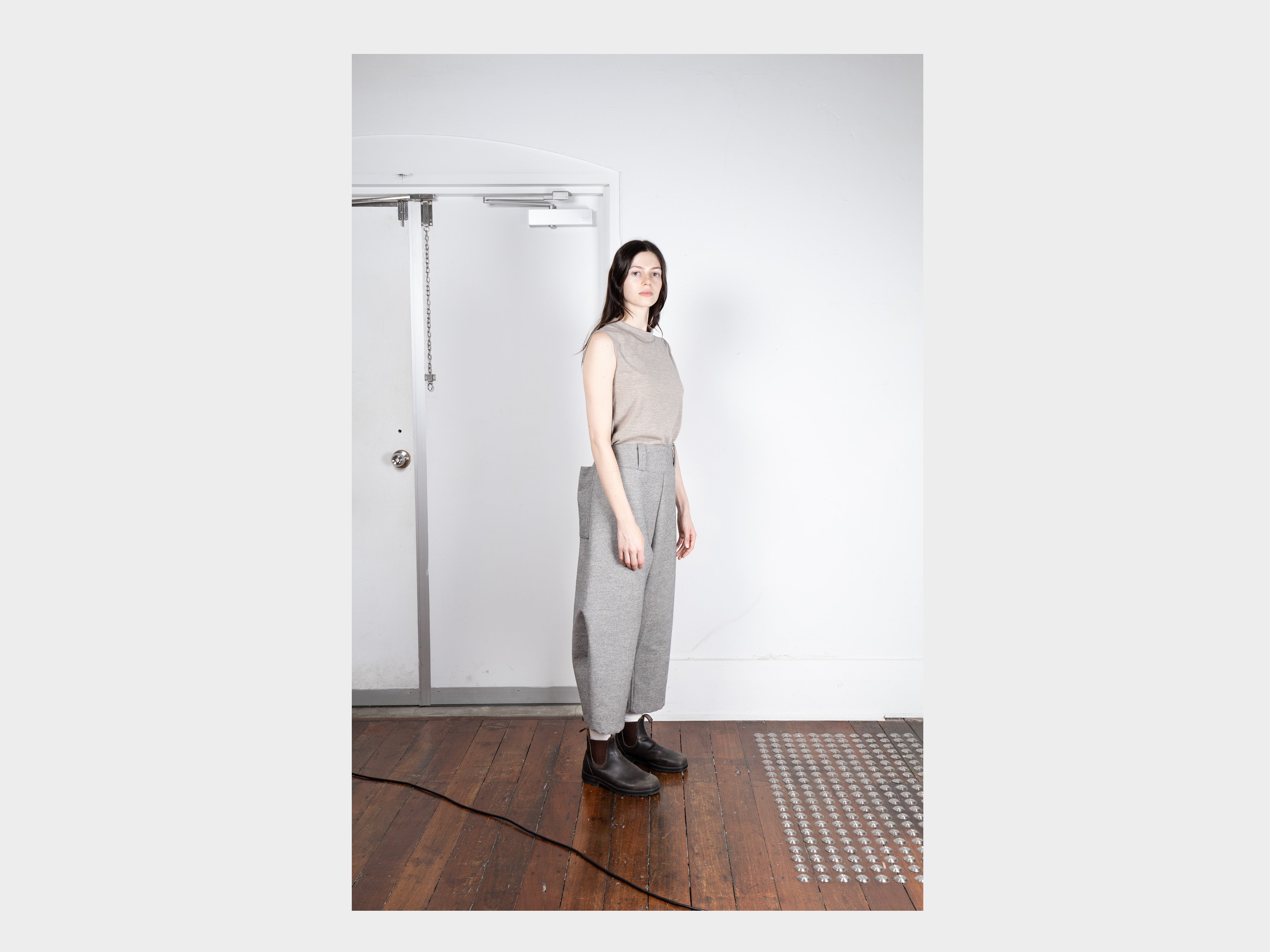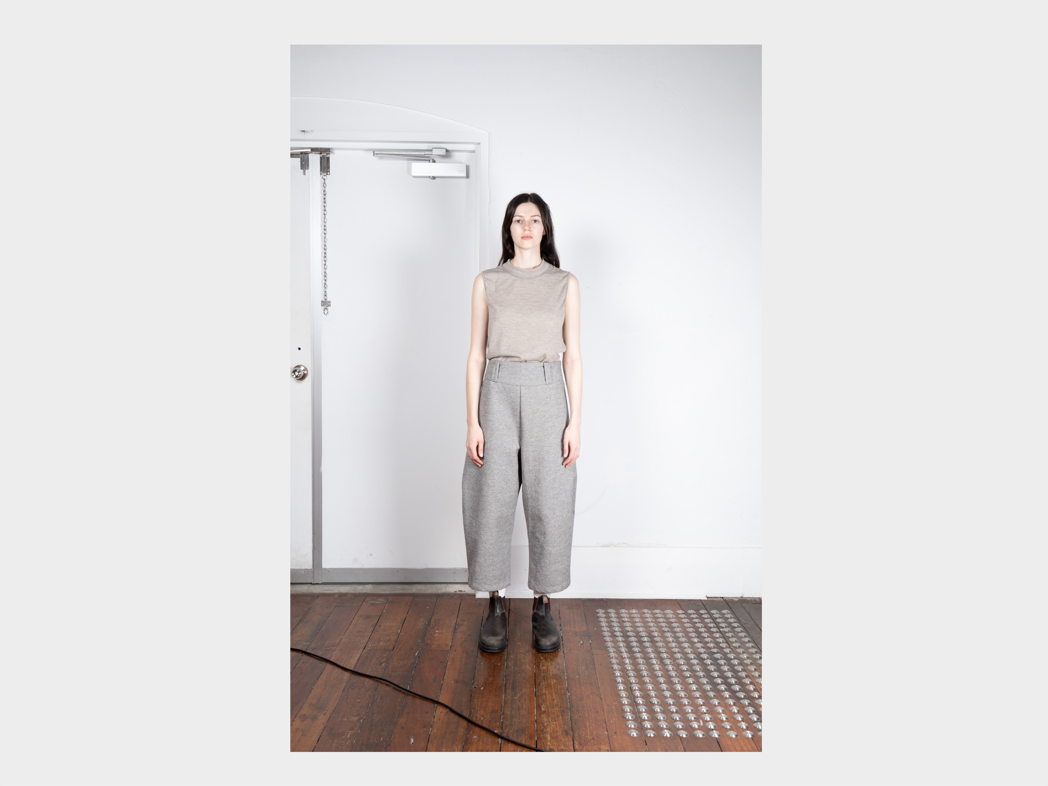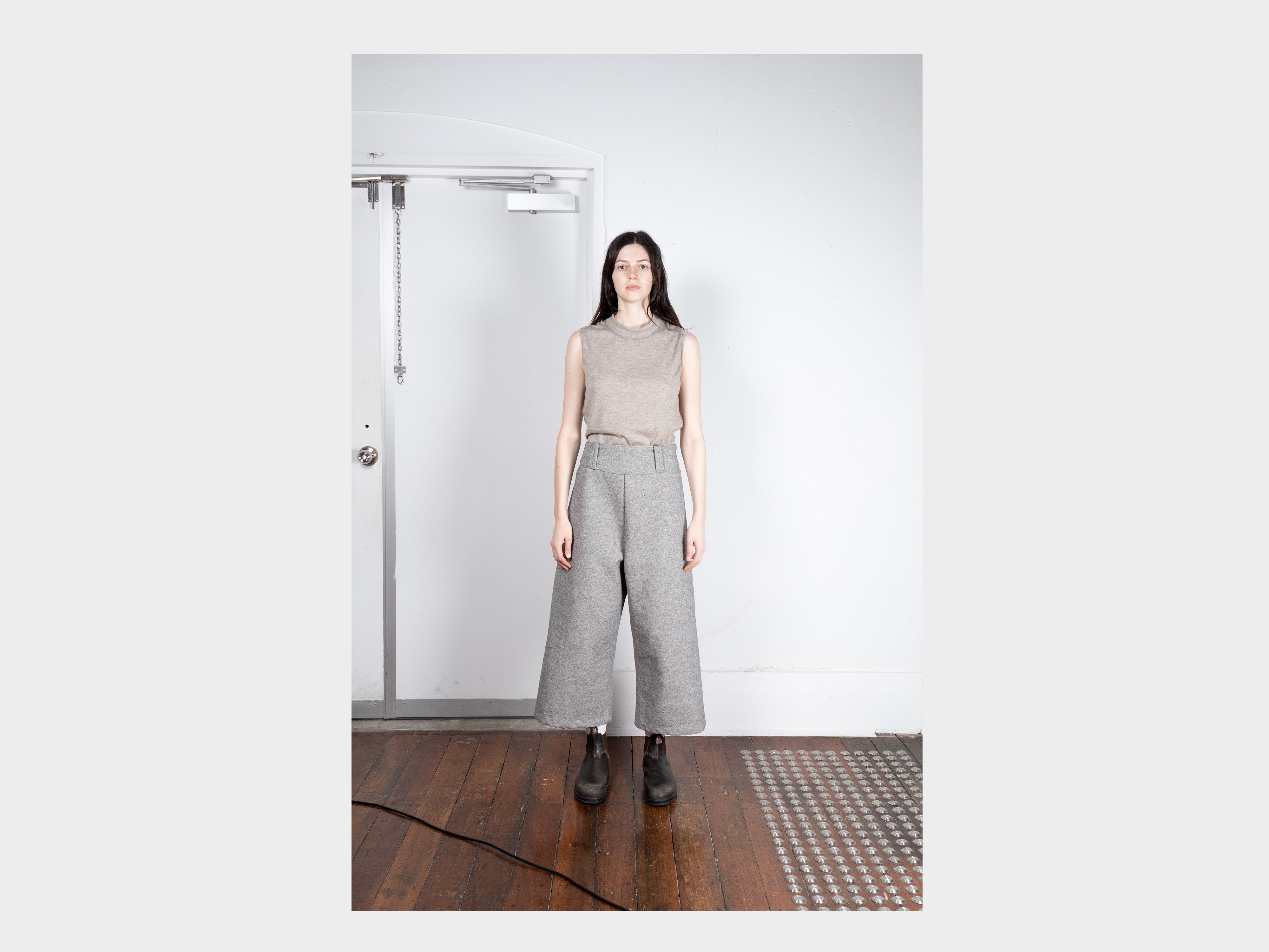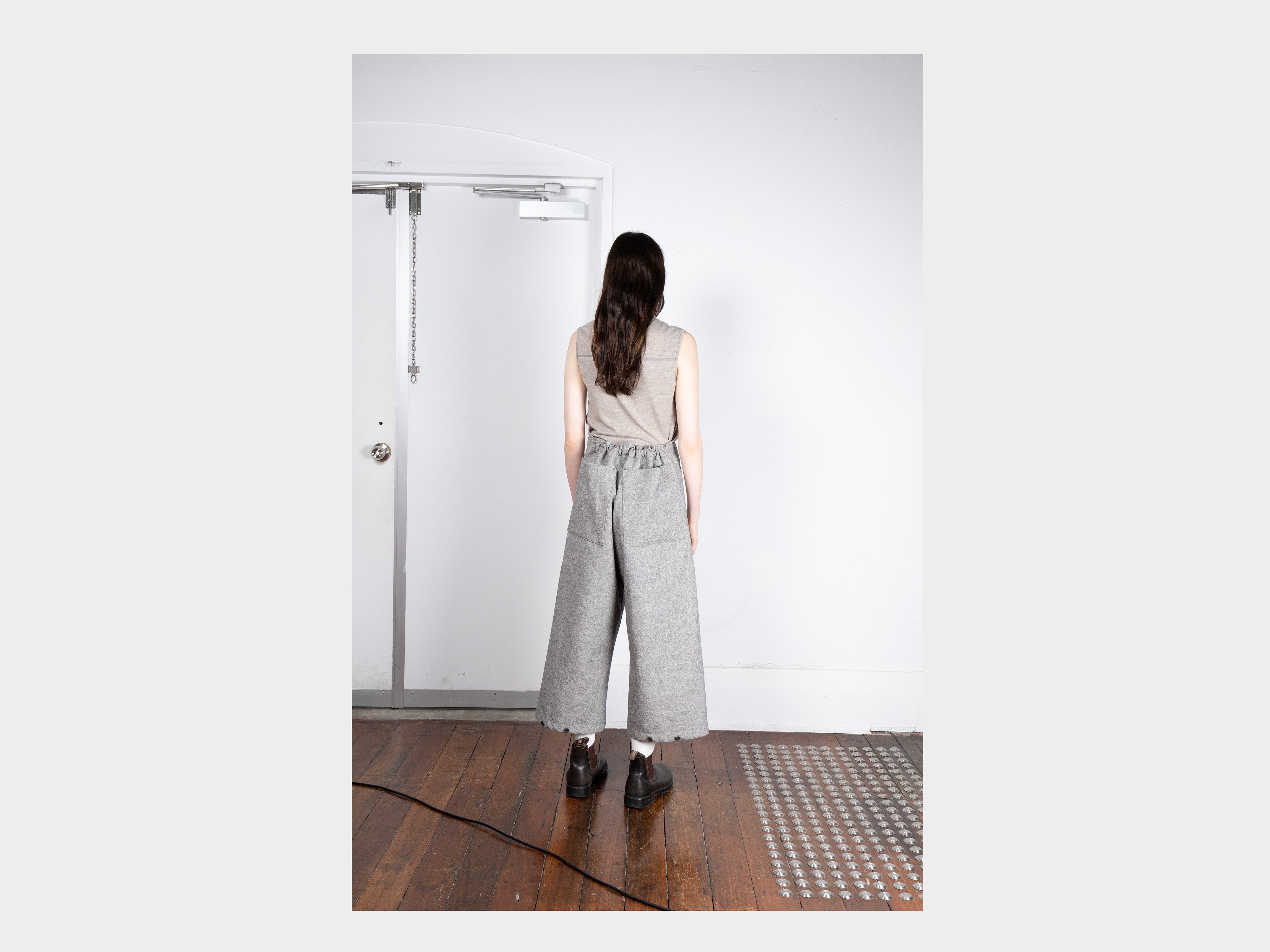 +Wide leg, flat front easy pants for women. Long crotch and generous leg, rear waistband includes elastic. Two large patch pockets on the rear give this garment its name. Buttons on hem can be used to cinch the leg. Made in Japan.