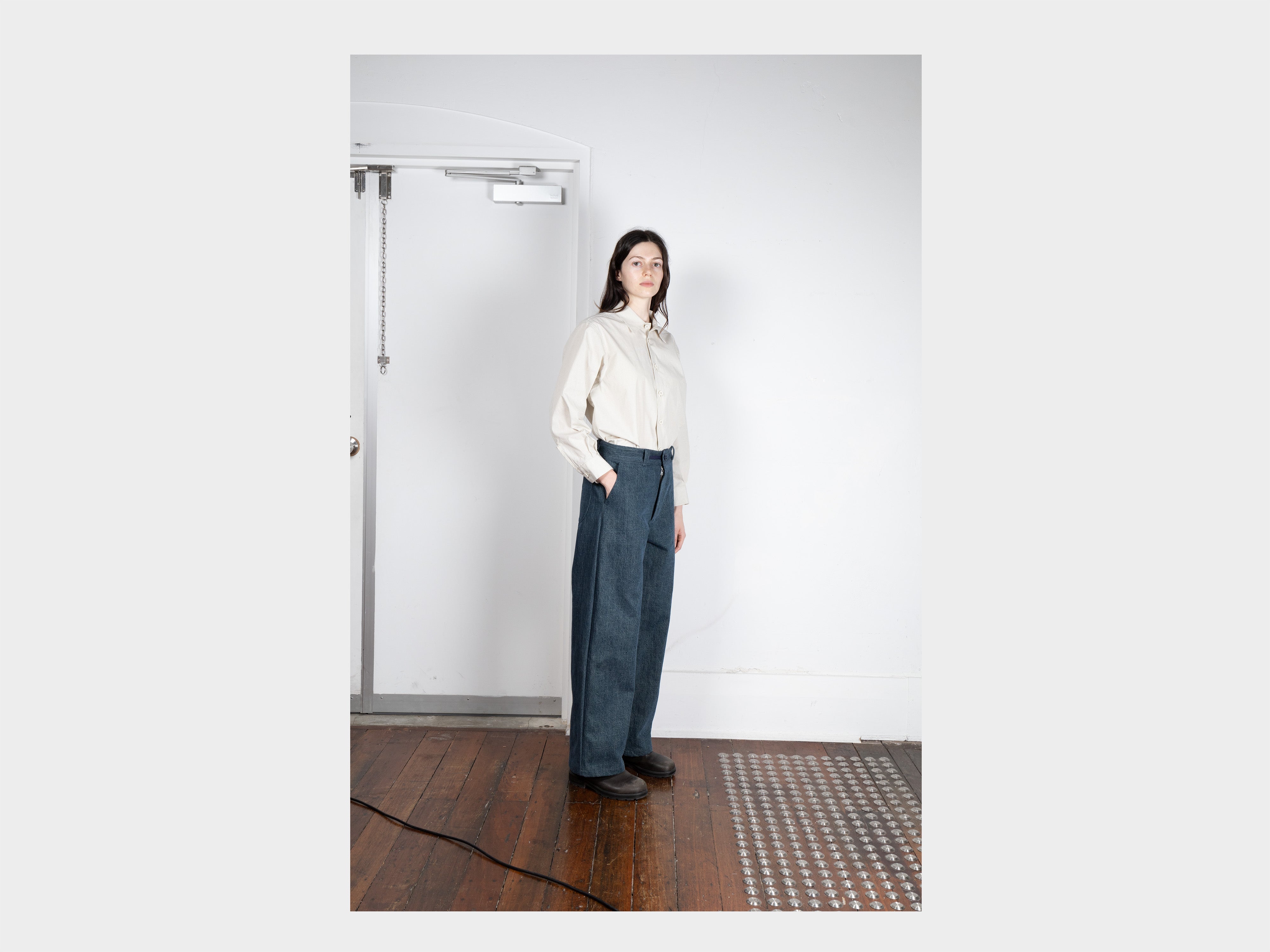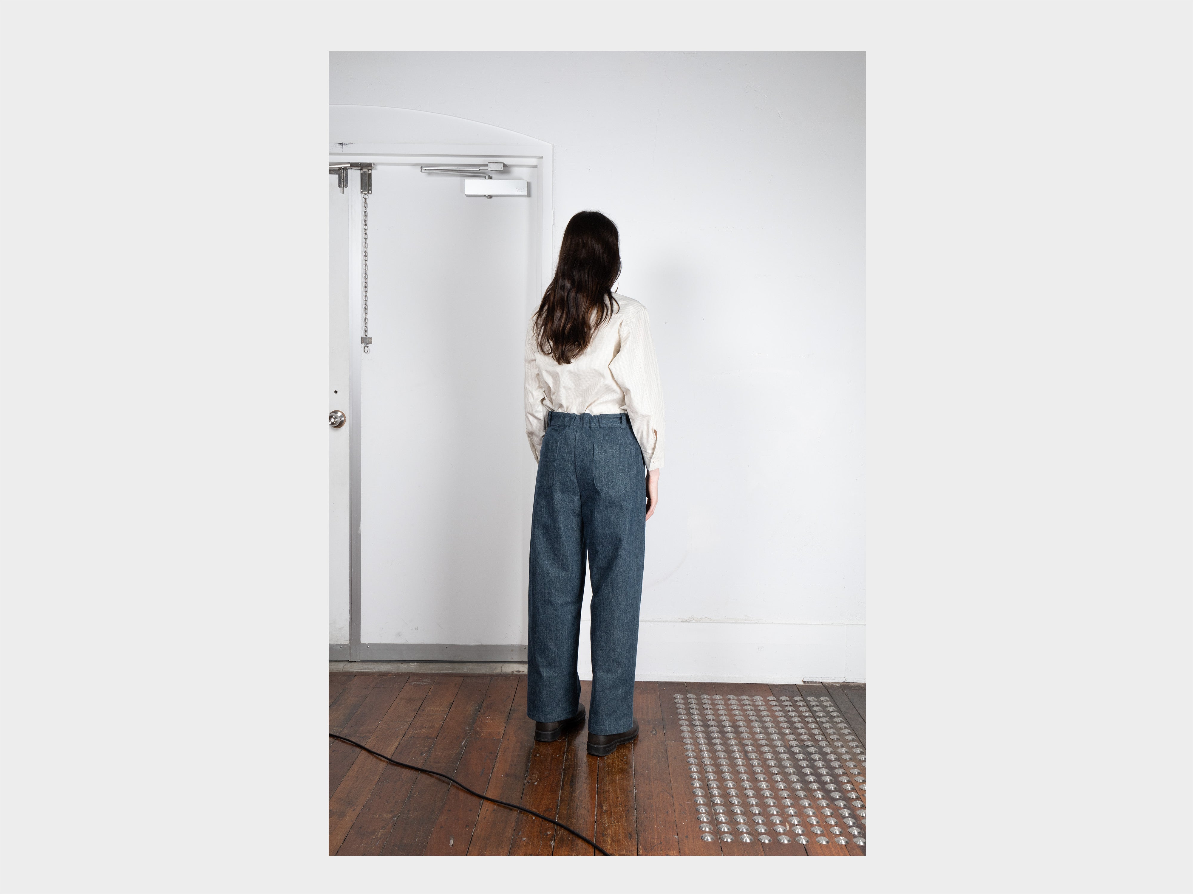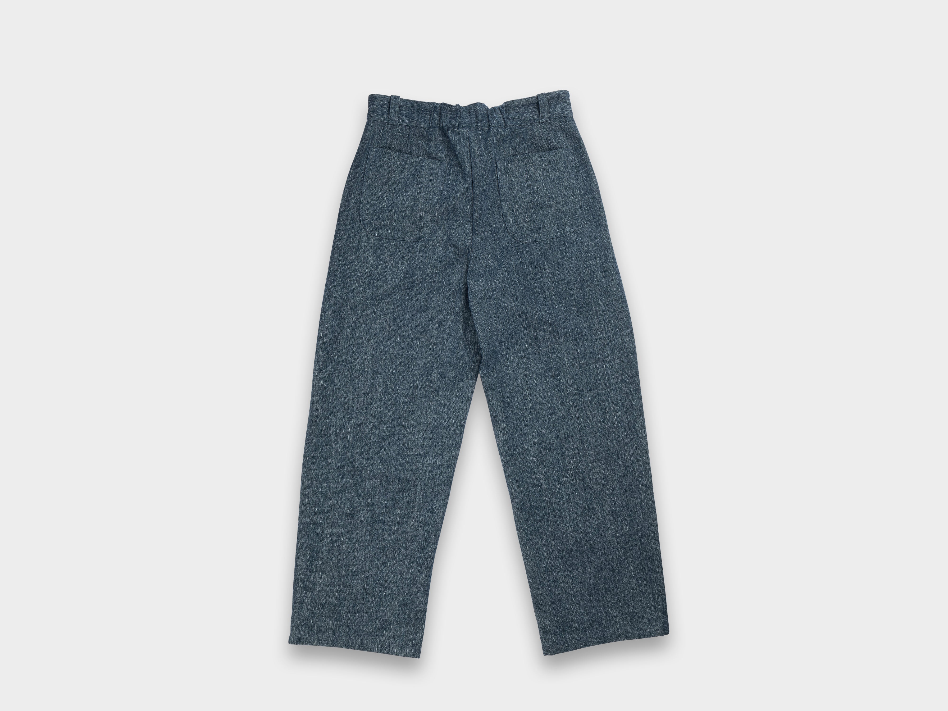 +Relaxed-leg trouser. Fitted at the hips and wide through the leg. Seat belt tape with adjustable button at the front, belt loops, elastic gusset at back, cut-away front pockets and rear patch pockets. Made in Japan.
