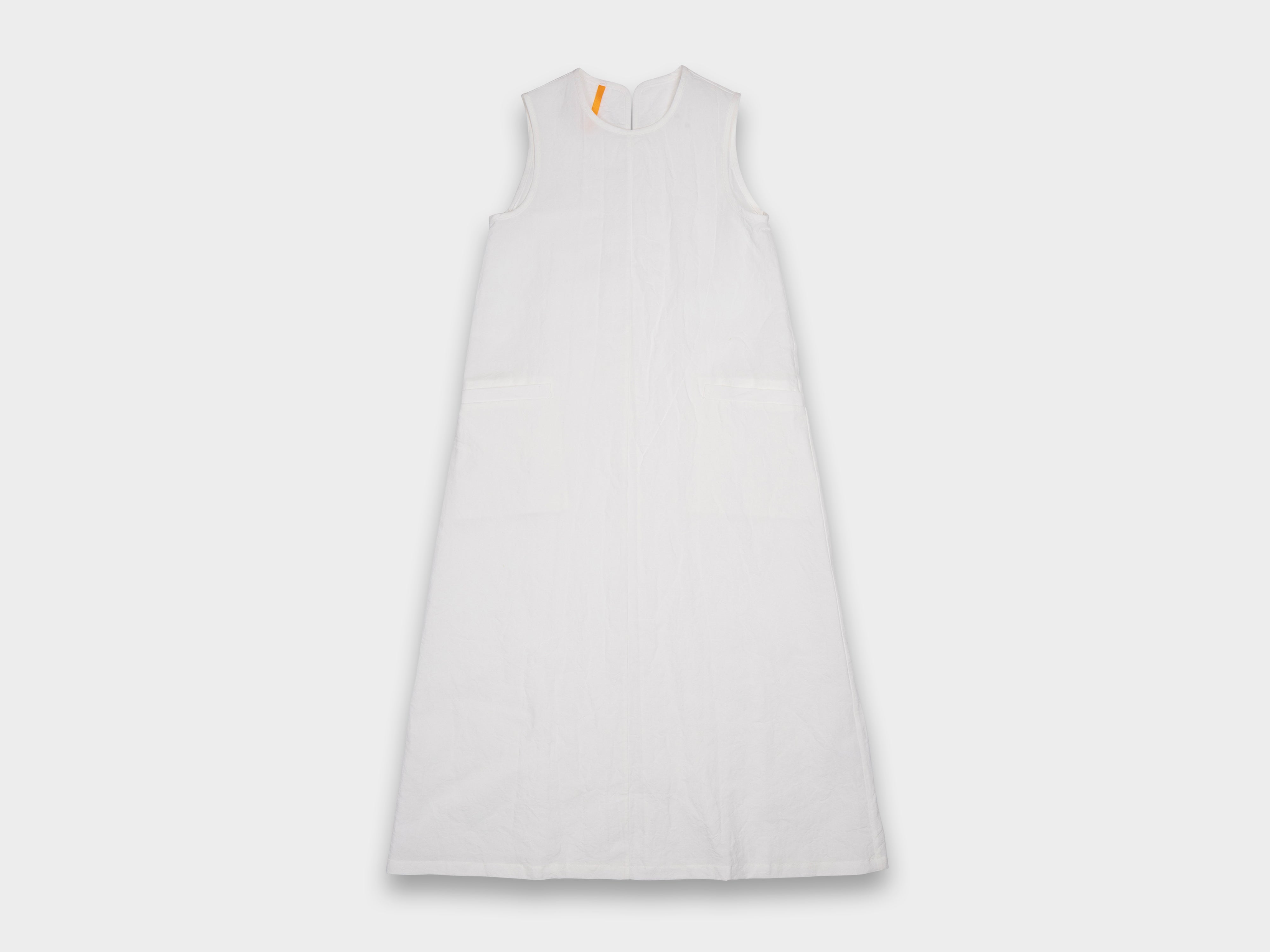A-line dress with a rounded neckline. Two welted pockets at front-hip, keyhole opening at the back neckline. Made in Japan.