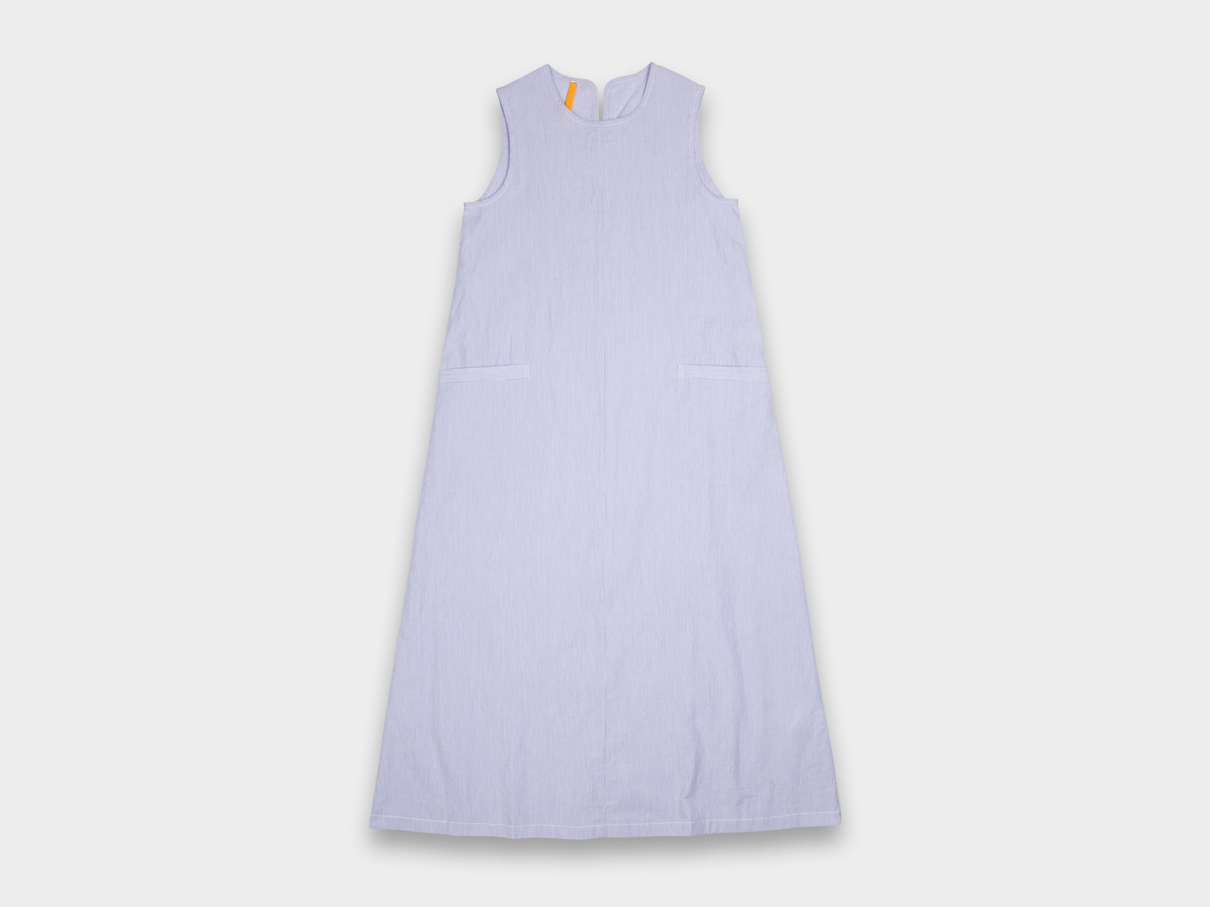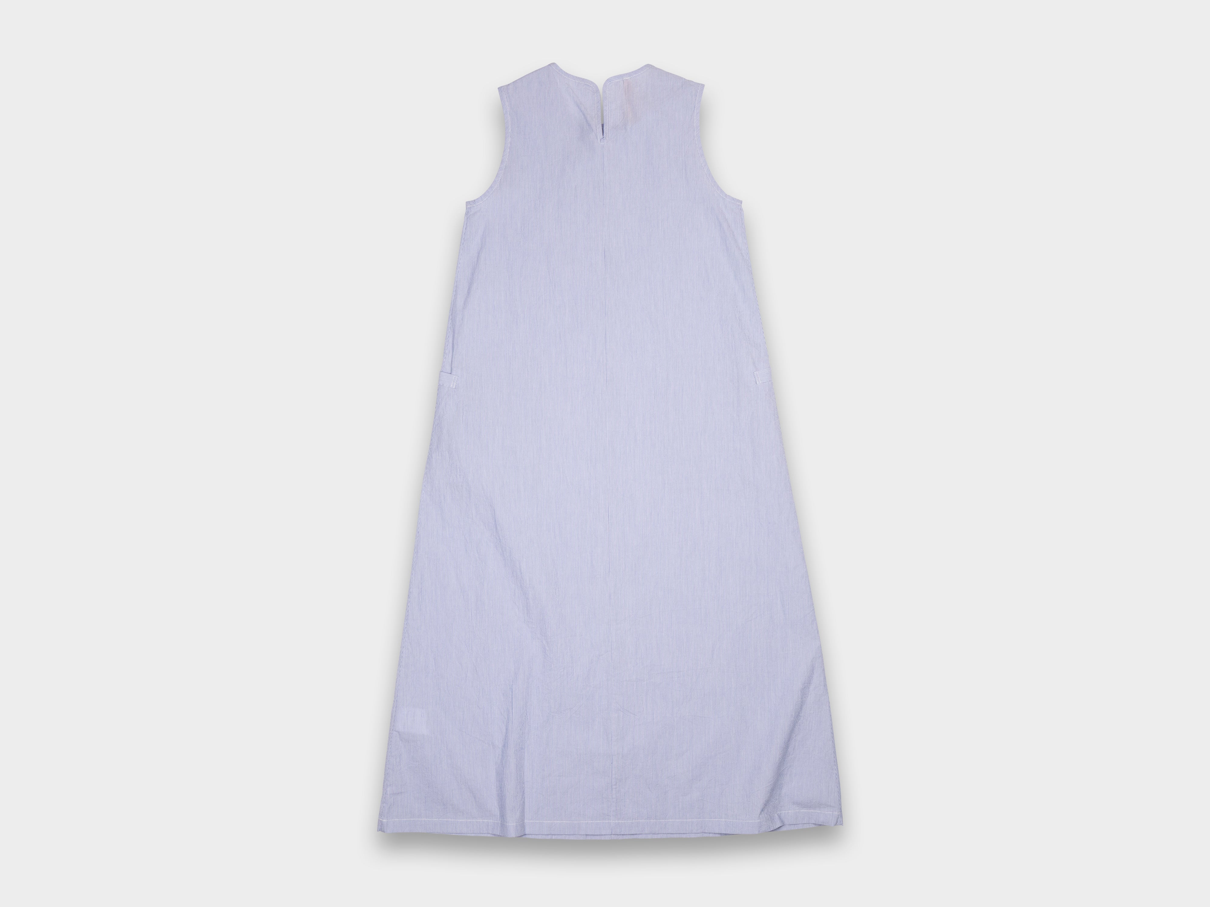 A-line dress with a rounded neckline. Two welted pockets at front-hip, keyhole opening at the back neckline. Made in Japan.